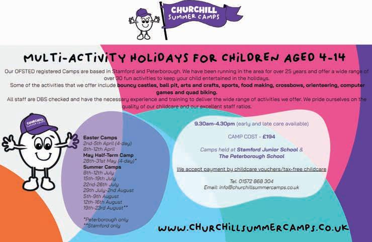 Explore with Will’s Walks Enjoy walks around Stamford and Rutland, exploring towns, villages and the open countryside. Some shorter walks of up to four miles and then some real leg stretchers which will tire you and the dog out. Available at www.theactivemag.com or from local stockists willswalks_adKM.indd 1 22/03/2023 20:01 9am-4pm £45perday Earlydropoff & latepickup Fun Friendship Respect 2024 Camps 12 weeks of fun Winter Camps: 2nd - 5th January 2024 12th - 16th February 2024 Easter Camps: 1st - 5th April 2024 8th - 12th April 2024 Summer Camps: 27th - 31st May 2024 22nd - 26th July 2024 29th July - 2nd August 2024 5th - 9th August 2024 12th - 16th August 2024 19th - 23rd August 2024 Autumn Camps: 21st - 25th October 2024 28th October - 1st November 2024 Annual Membership www.themillwellbeing.co.uk (main sponsor of MPW Active) Follow MPW Active and message the words "Active Mag" for a nice discount code! @mpwactivemrw /mpwactive Childcare Vouchers MPW Active Holiday Camps for children aged 5-12 yrs Ketton Sports and Community Centre PE9 3SZ
