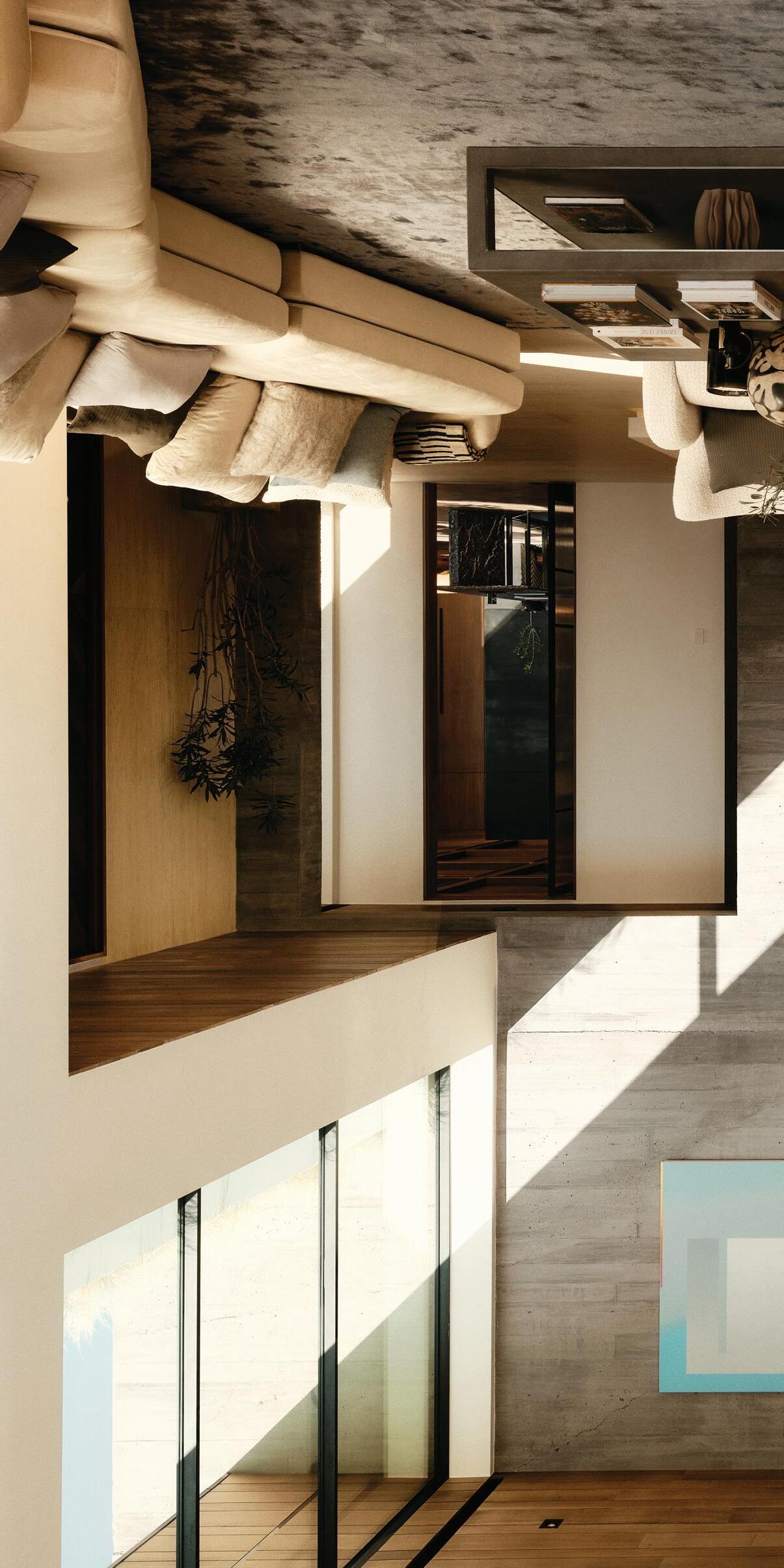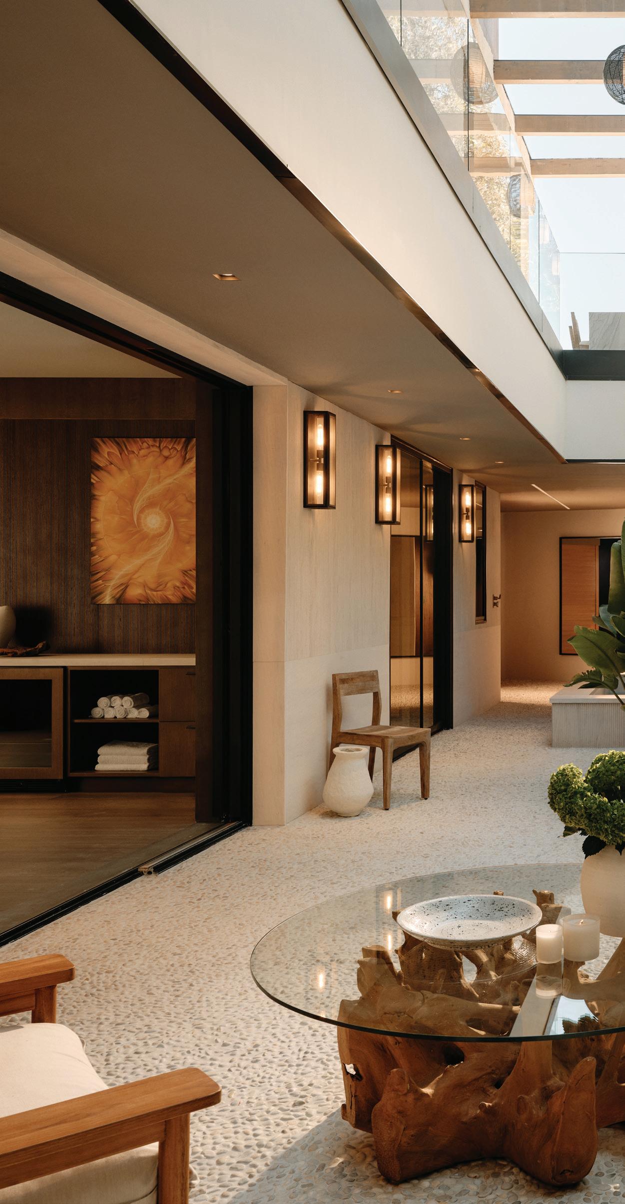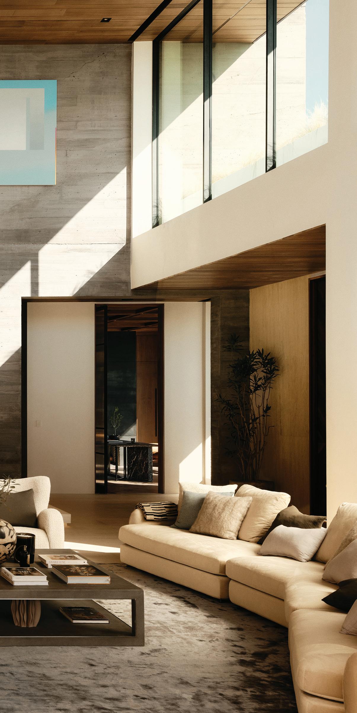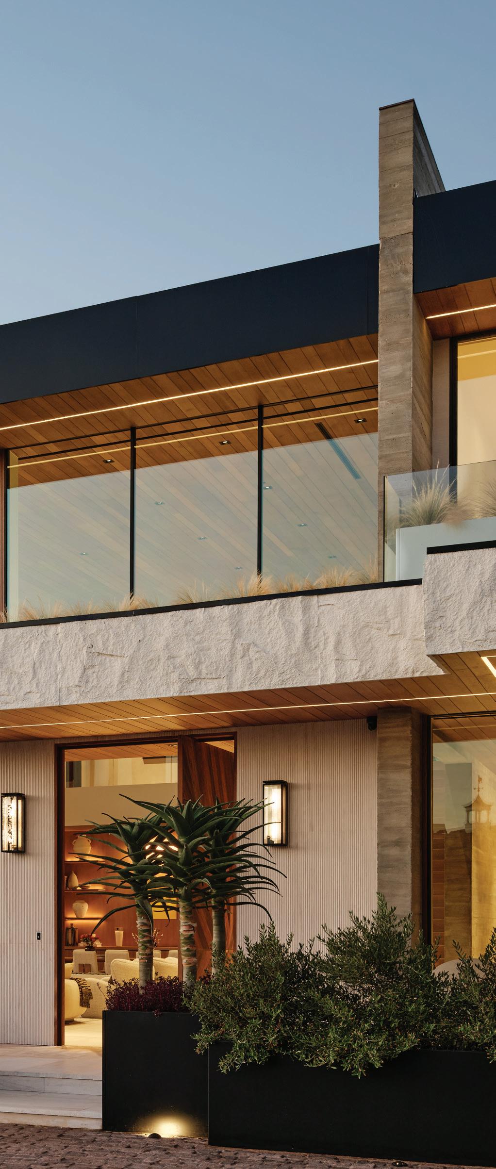 Crafted over four years and thoughtfully designed with Tiffany Harris Design in collaboration with Santiago Arana, Villa Serenique spans 20,000 square feet on over 1 acres with nine bedrooms and is wrapped—inside and out—with textured Portuguese limestone, which was chiseled onsite for cut-to-fit shapes and sizes. Additional interior elements include Roman plaster walls, texturerich Travertine, and board-formed concrete, all of which harmonize to create a deeply calming atmosphere.