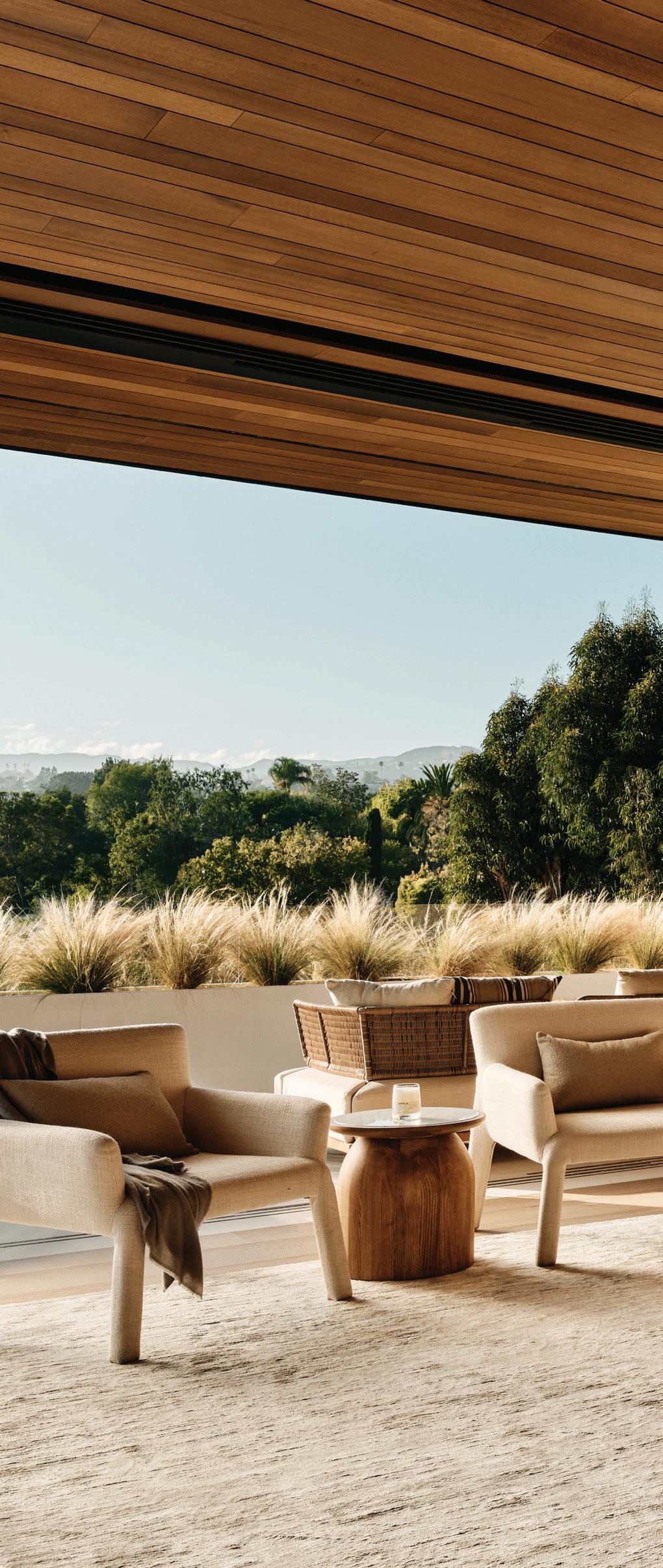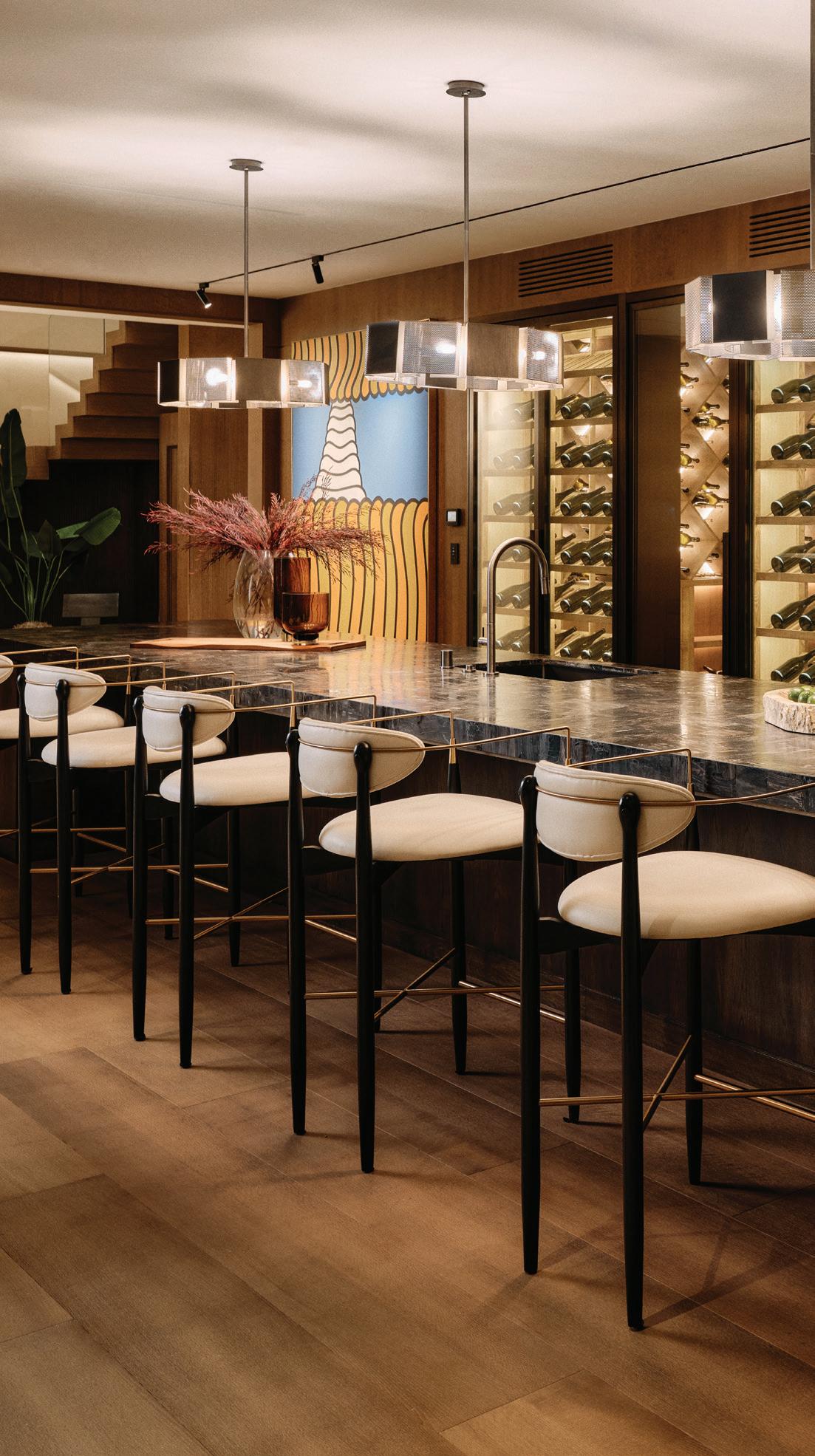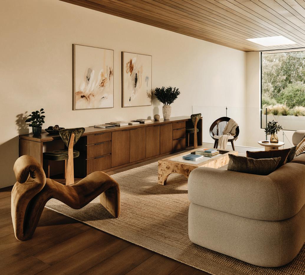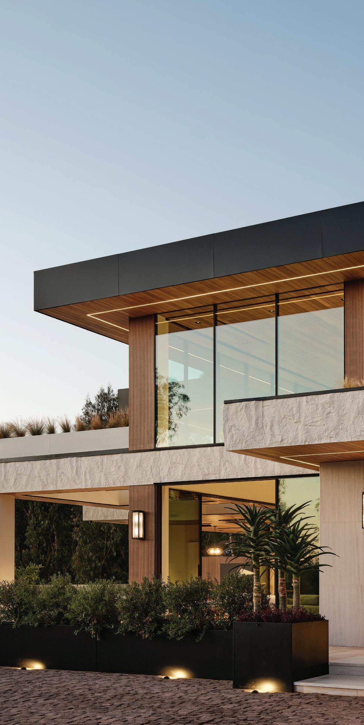 Crafted over four years and thoughtfully designed with Tiffany Harris Design in collaboration with Santiago Arana, Villa Serenique spans 20,000 square feet on over 1 acres with nine bedrooms and is wrapped—inside and out—with textured Portuguese limestone, which was chiseled onsite for cut-to-fit shapes and sizes. Additional interior elements include Roman plaster walls, texturerich Travertine, and board-formed concrete, all of which harmonize to create a deeply calming atmosphere.