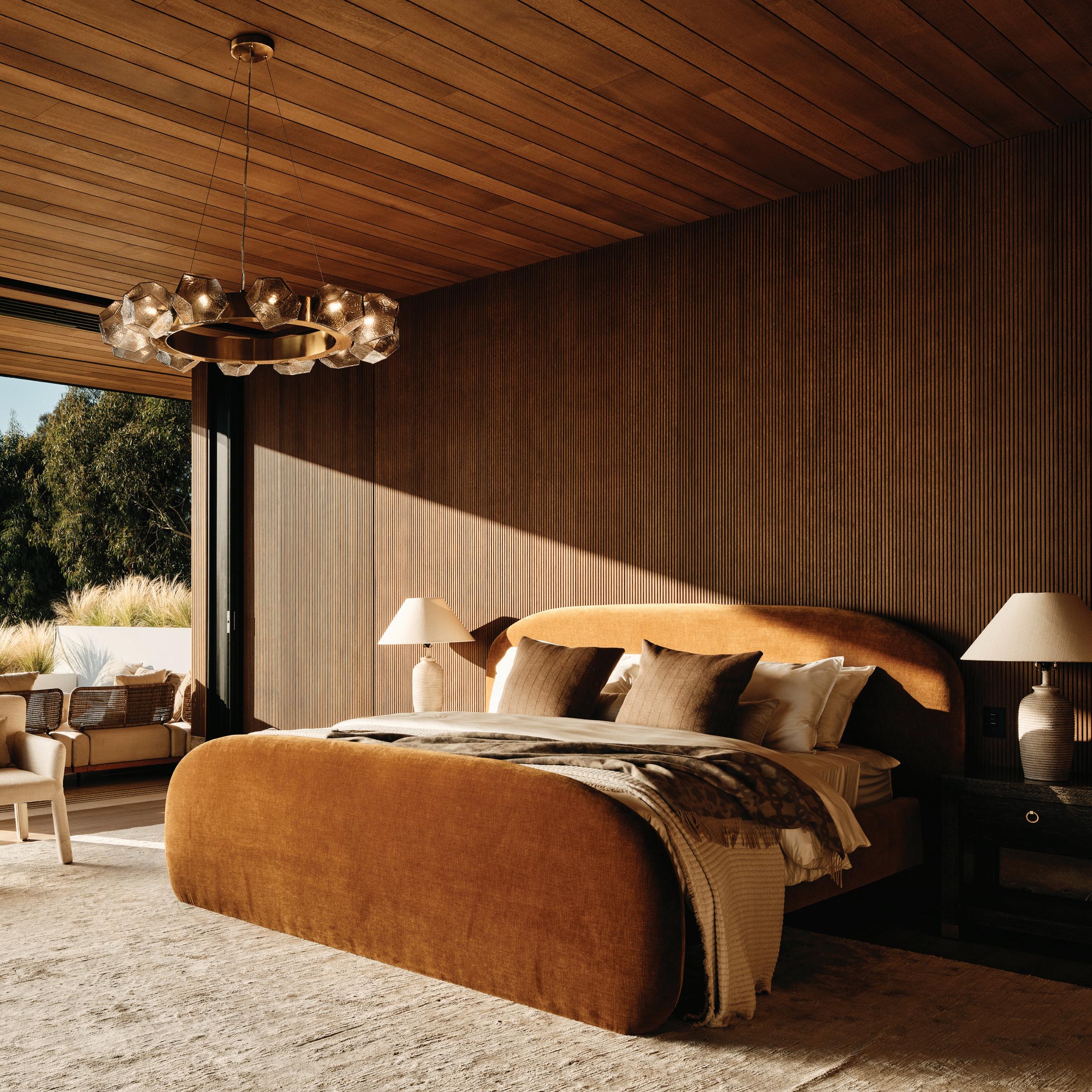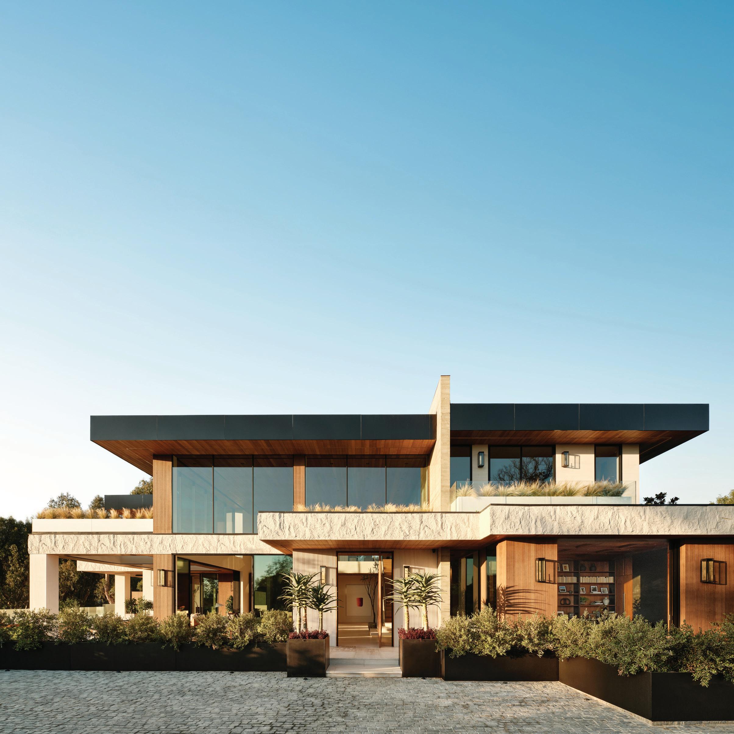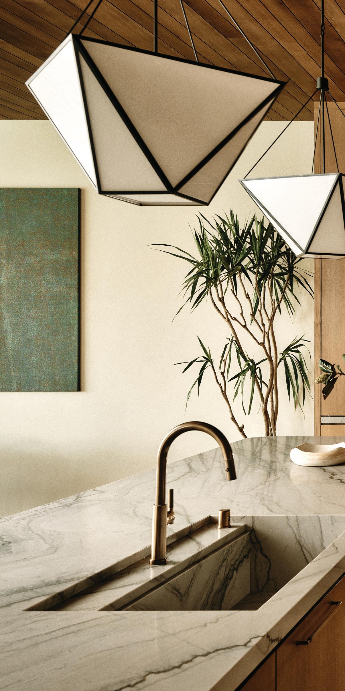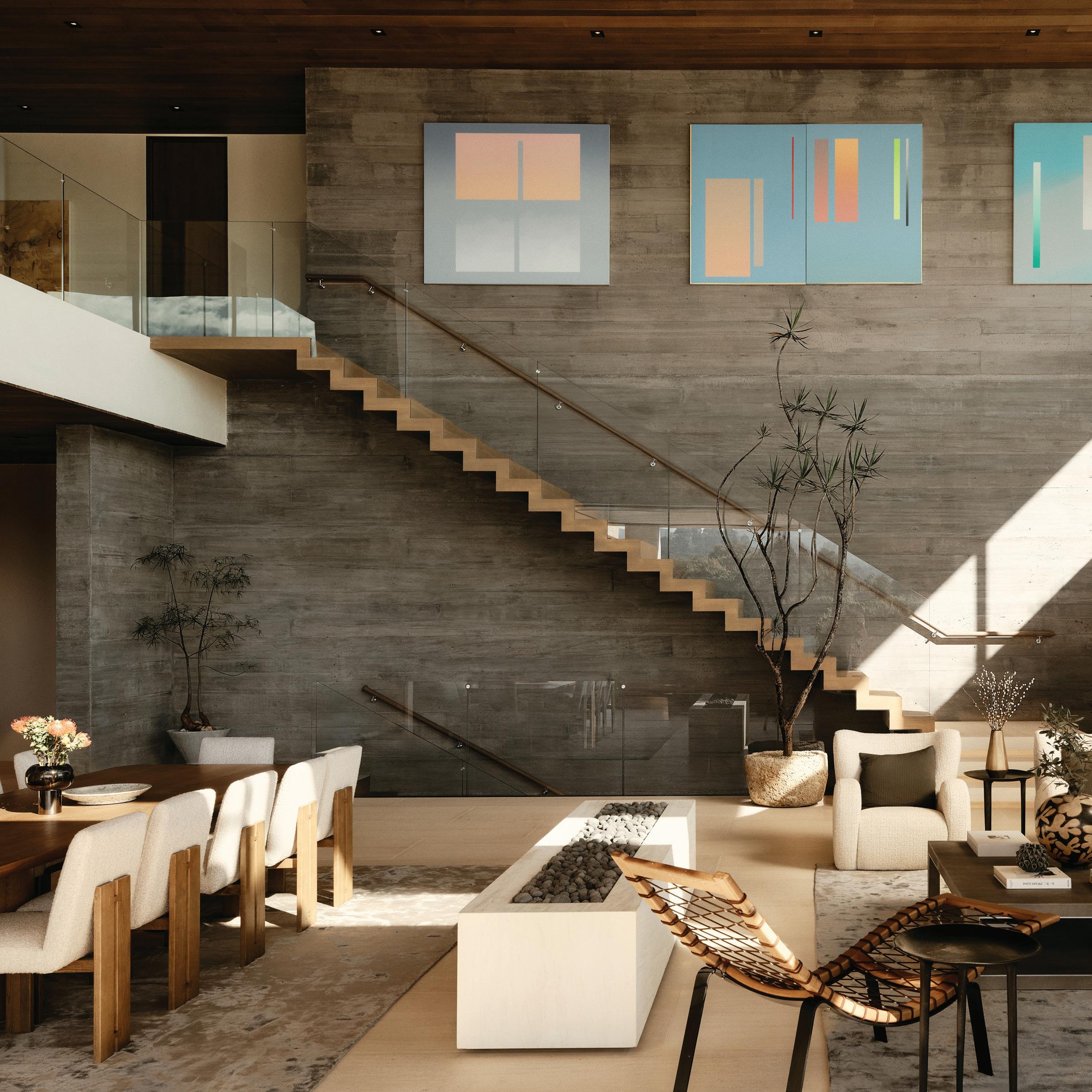 Crafted over four years and thoughtfully designed with Tiffany Harris Design in collaboration with Santiago Arana, Villa Serenique spans 20,000 square feet on over 1 acres with nine bedrooms and is wrapped—inside and out—with textured Portuguese limestone, which was chiseled onsite for cut-to-fit shapes and sizes. Additional interior elements include Roman plaster walls, texturerich Travertine, and board-formed concrete, all of which harmonize to create a deeply calming atmosphere.