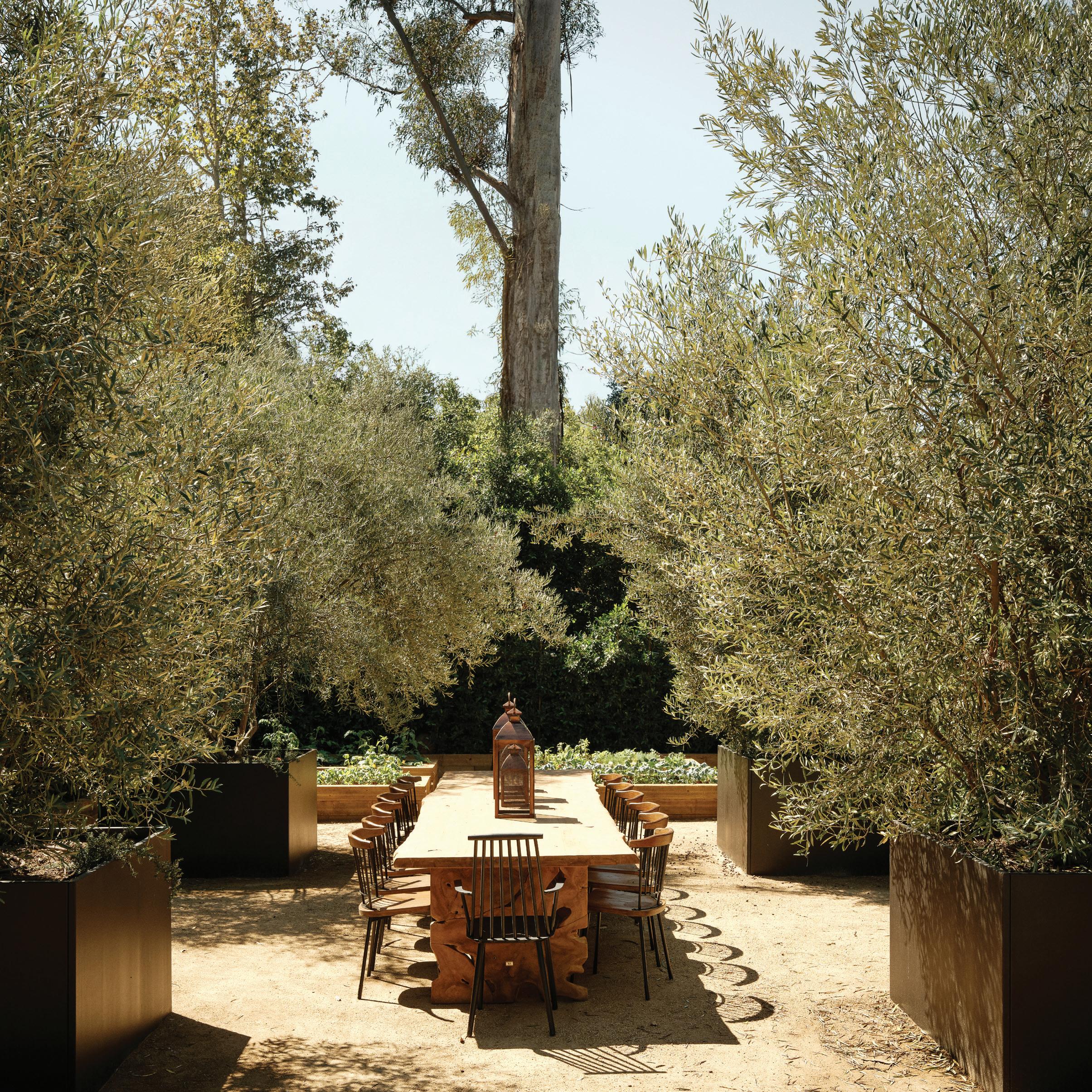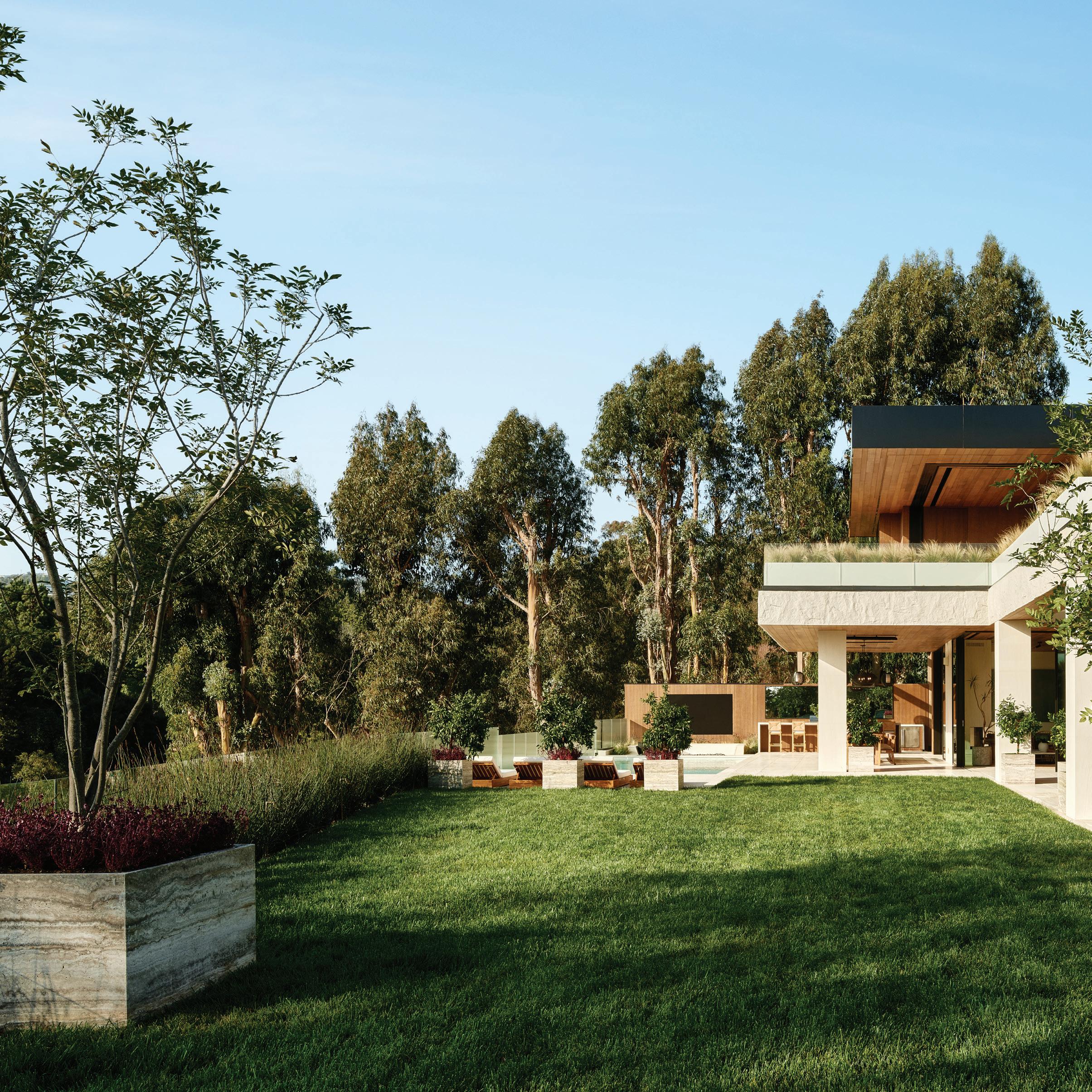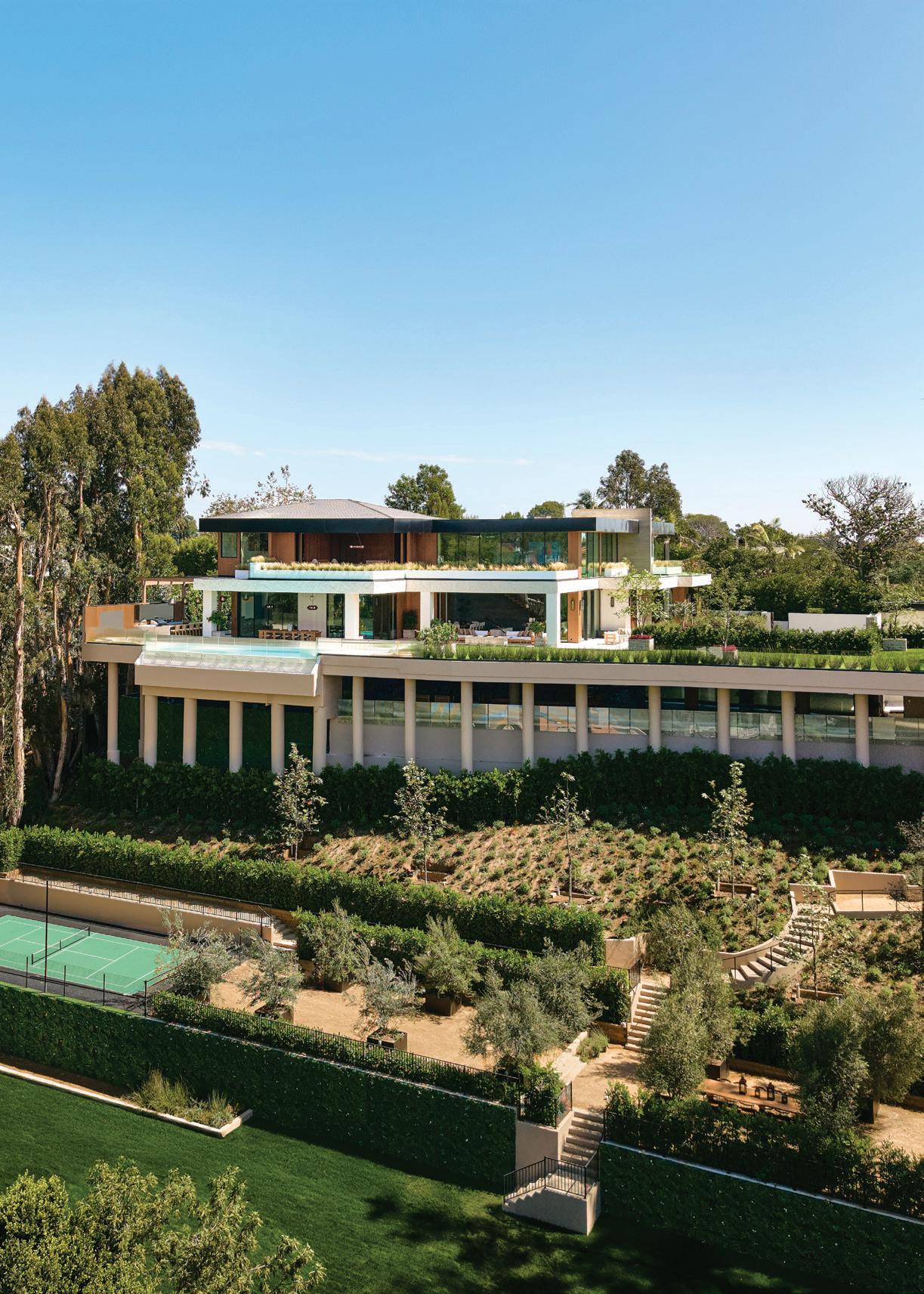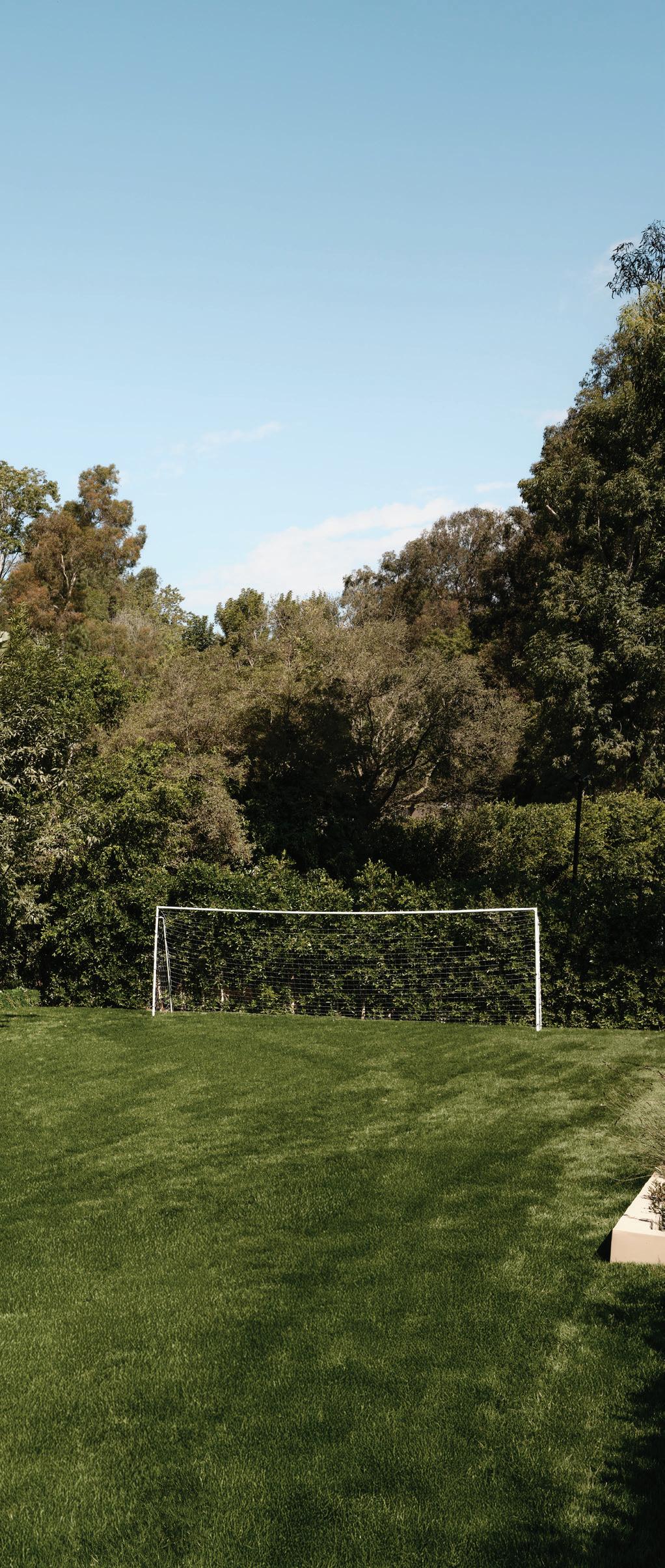 Just below this hillside home, accessible by stairs or a separate street entrance, is another expanse of backyard. Here, find a soccer field, a pickleball court, garden, and an Italianinspired dining area surrounded by mature olive trees.