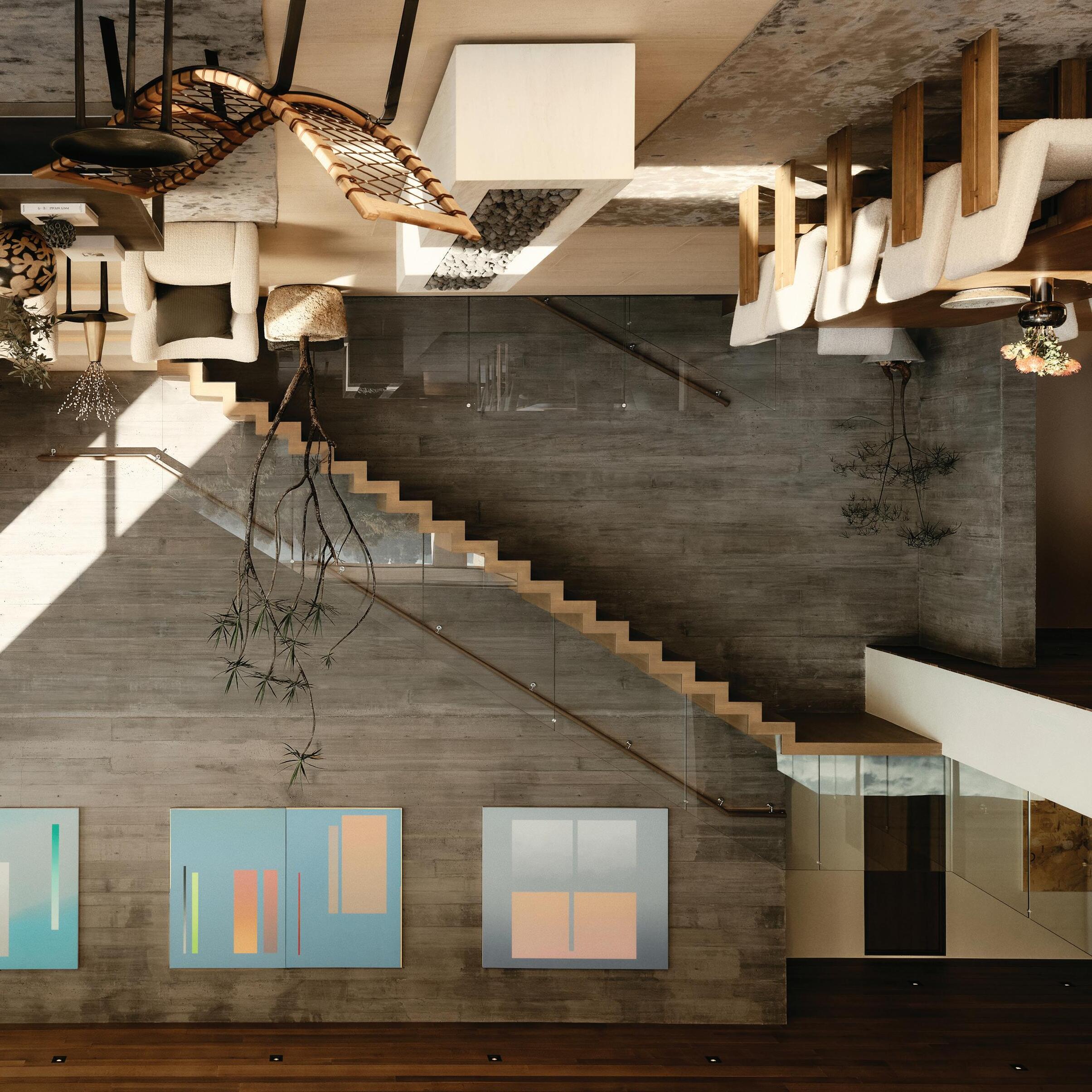 Ascend a floating staircase, engineered to support itself, to the upper level, which enjoys far-reaching canyon and city views. A lounge and TV area sits outside three ensuite bedrooms.