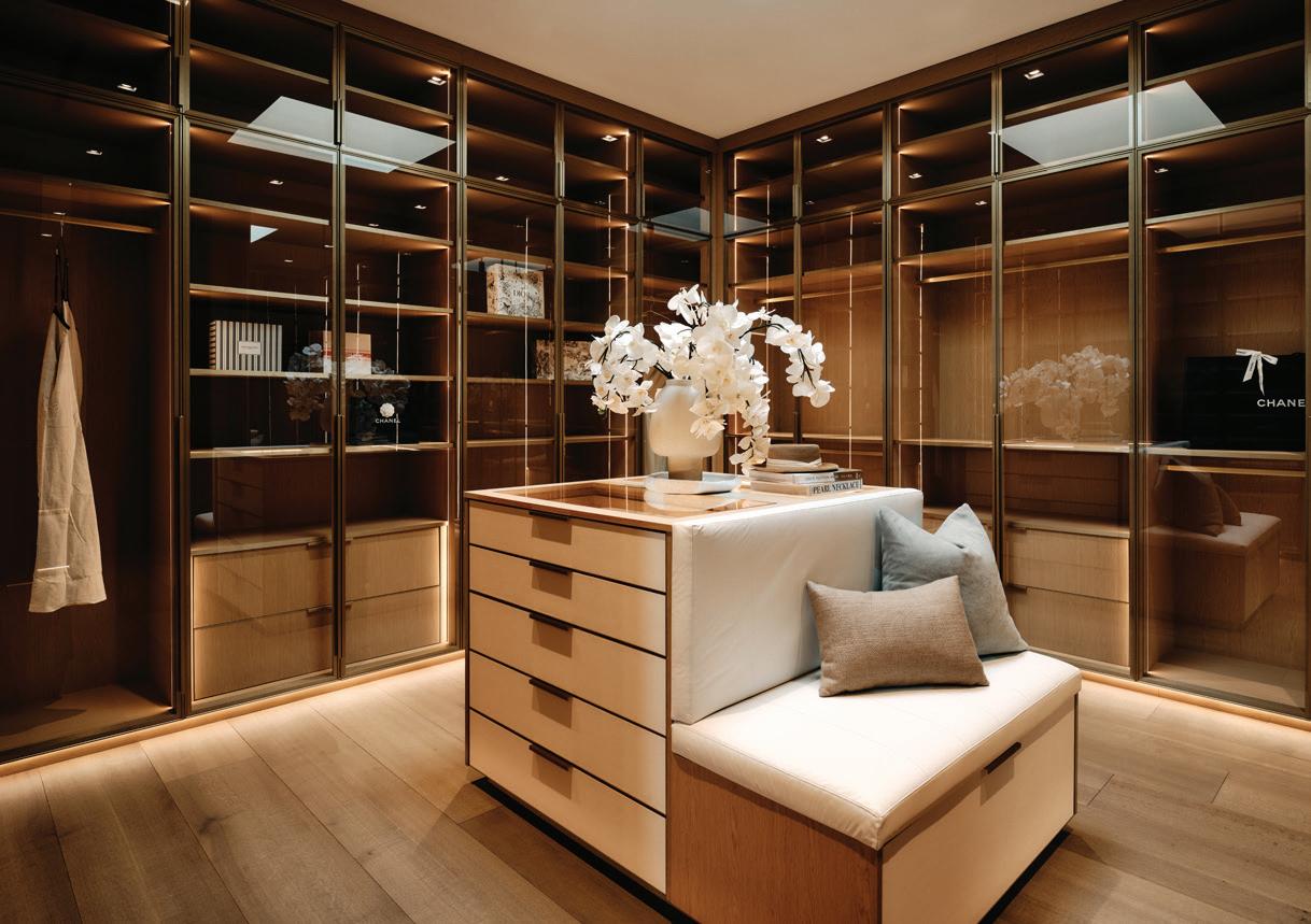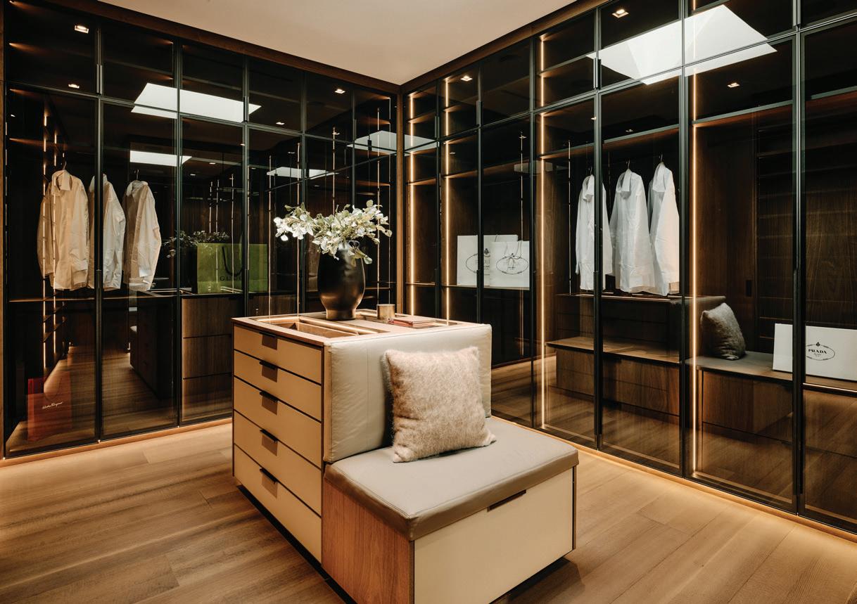 Dual walk-in closets include custom leather-backed builtins and feature islands for additional storage.