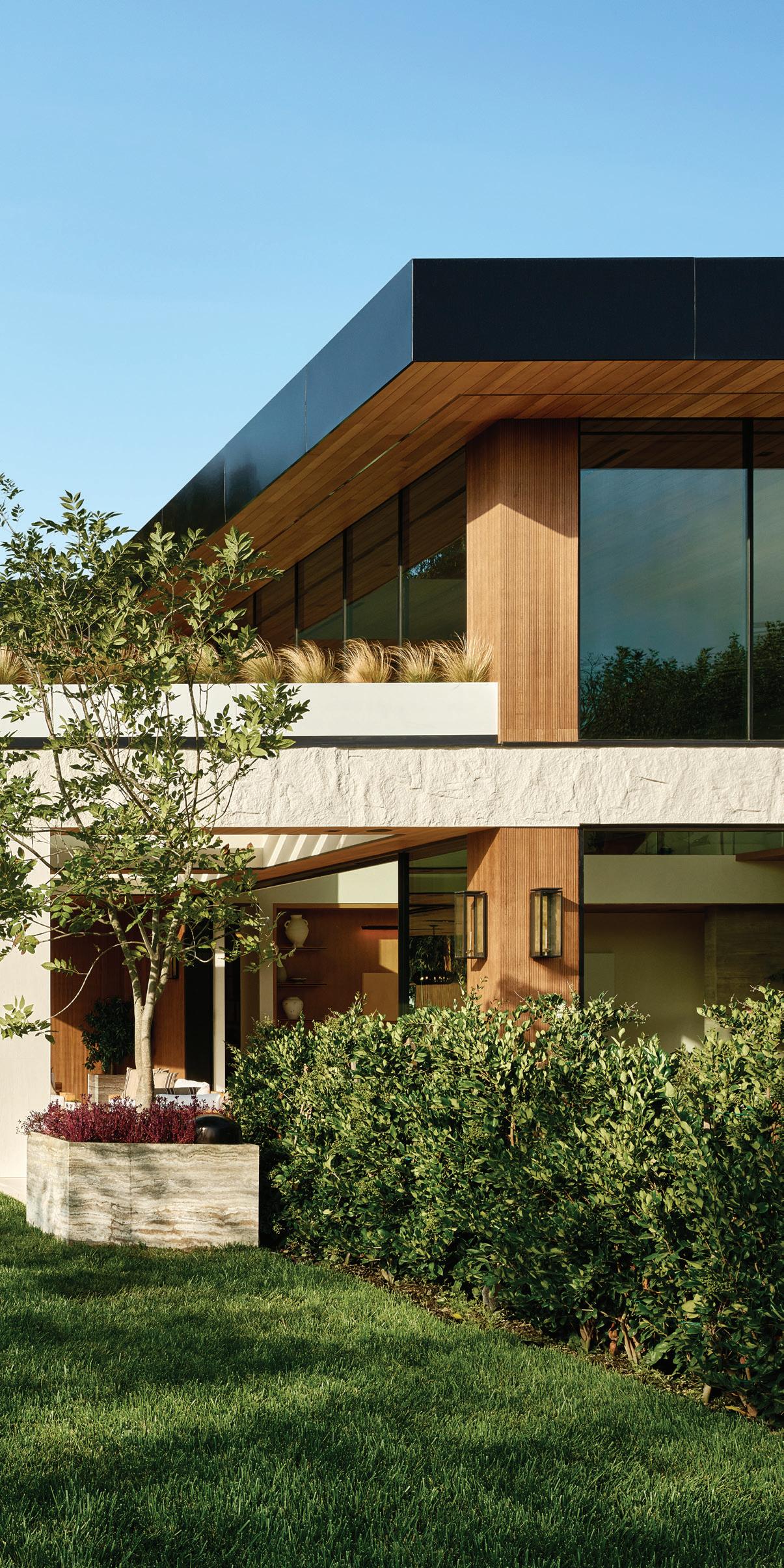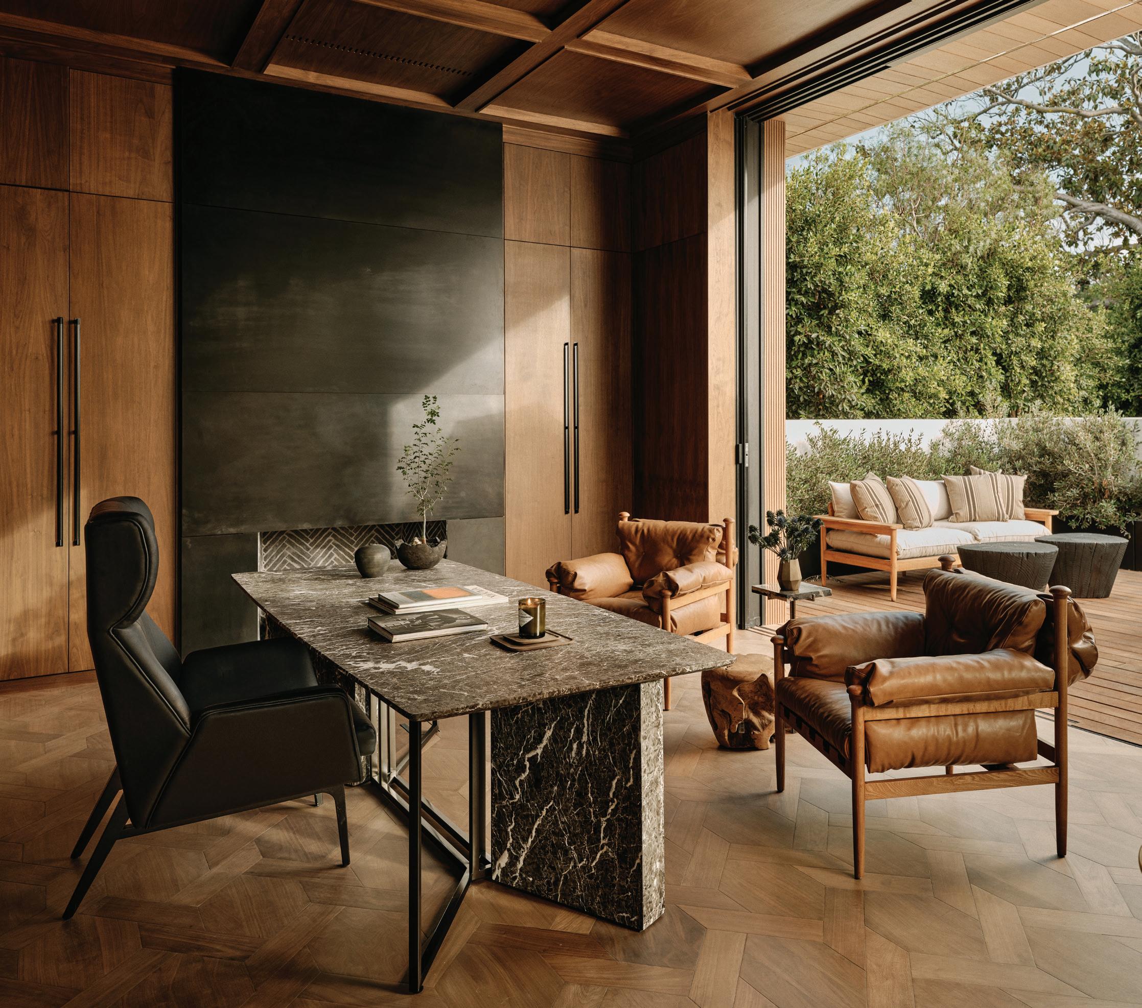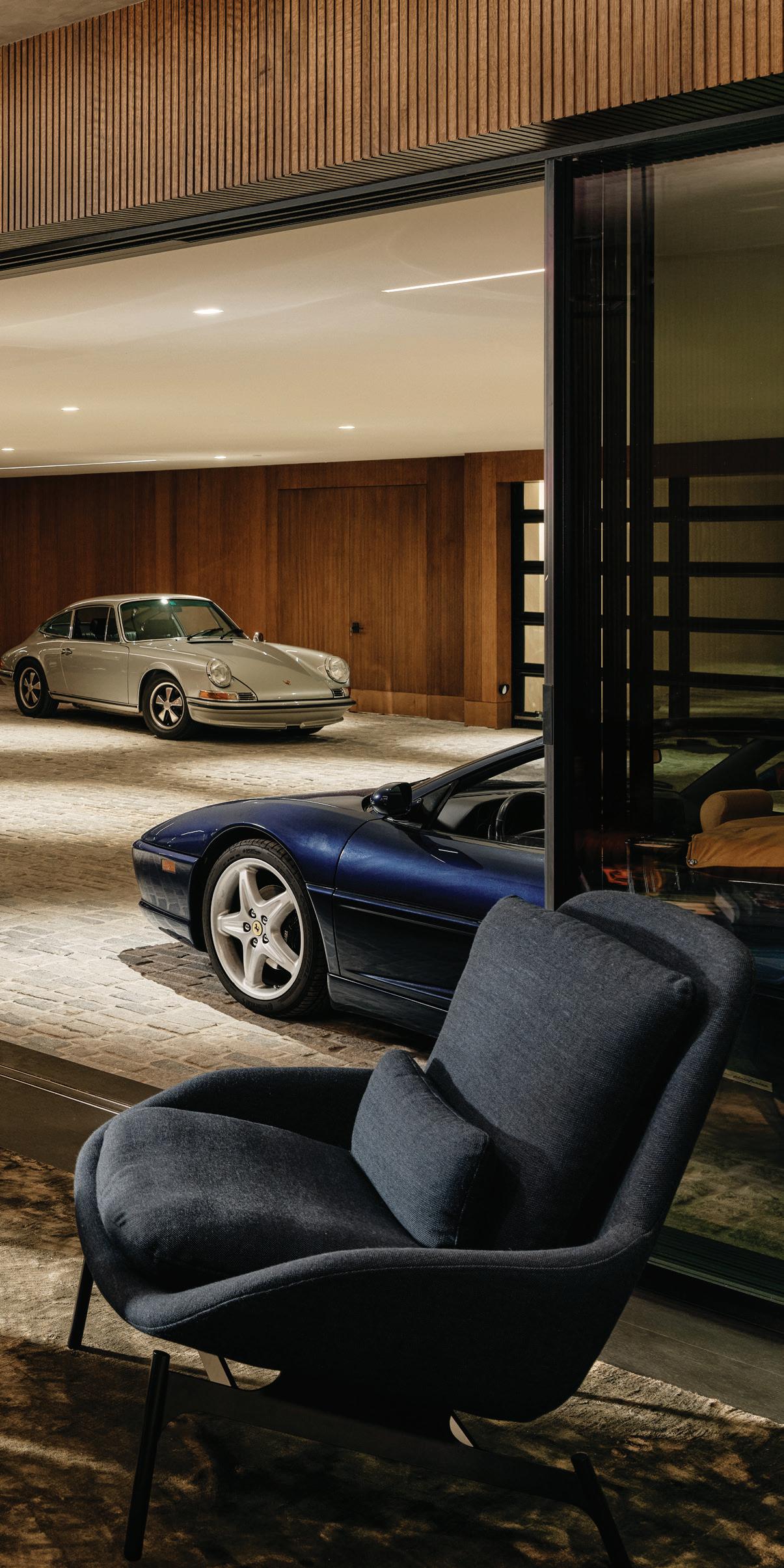 For the entertaining wing, a car gallery is designed with walls of windows with views, and with a movie screen, providing a unique drive-instyle movie-watching experience. An office looks out to the car garage, with access to the pool area. A steel patinated door takes you inside.