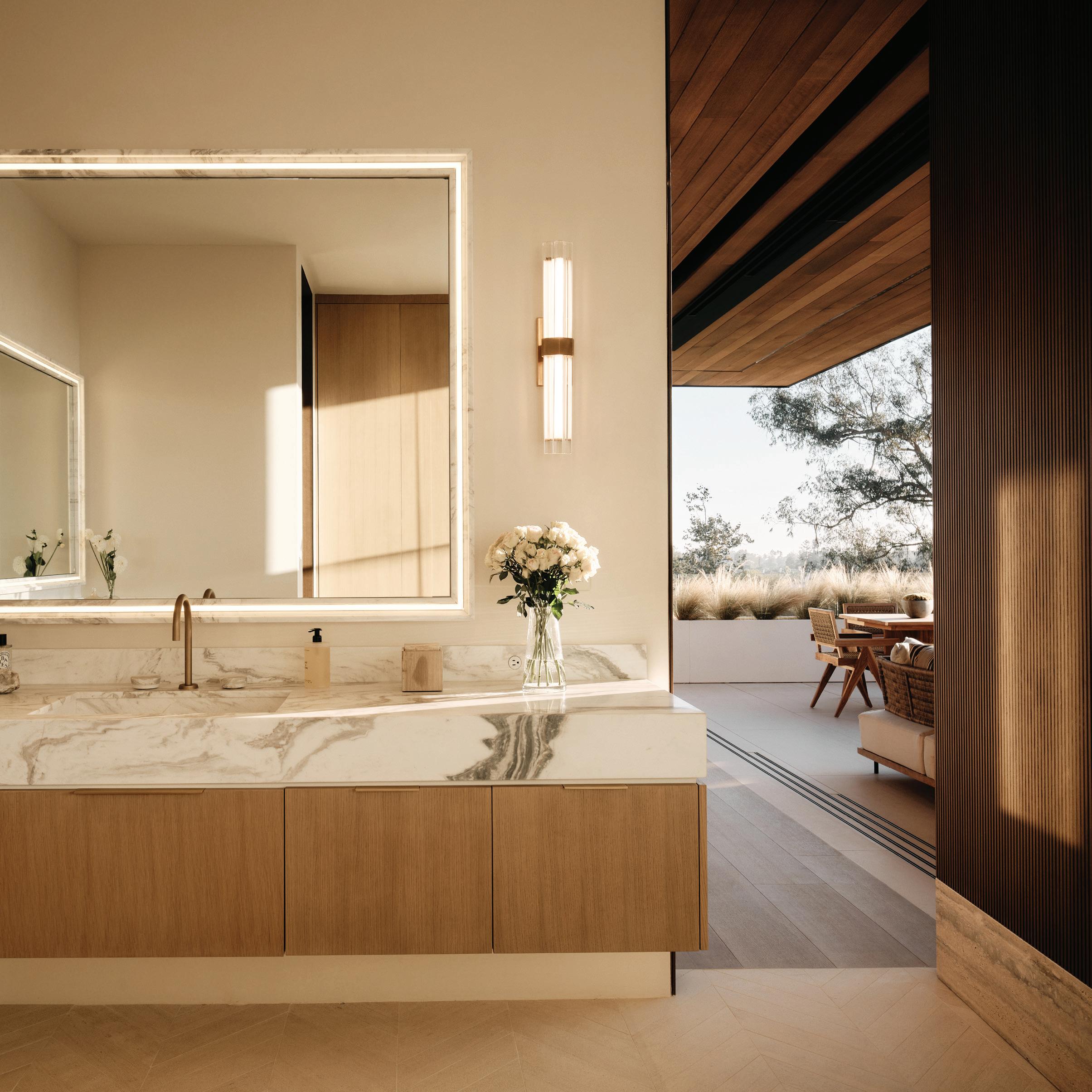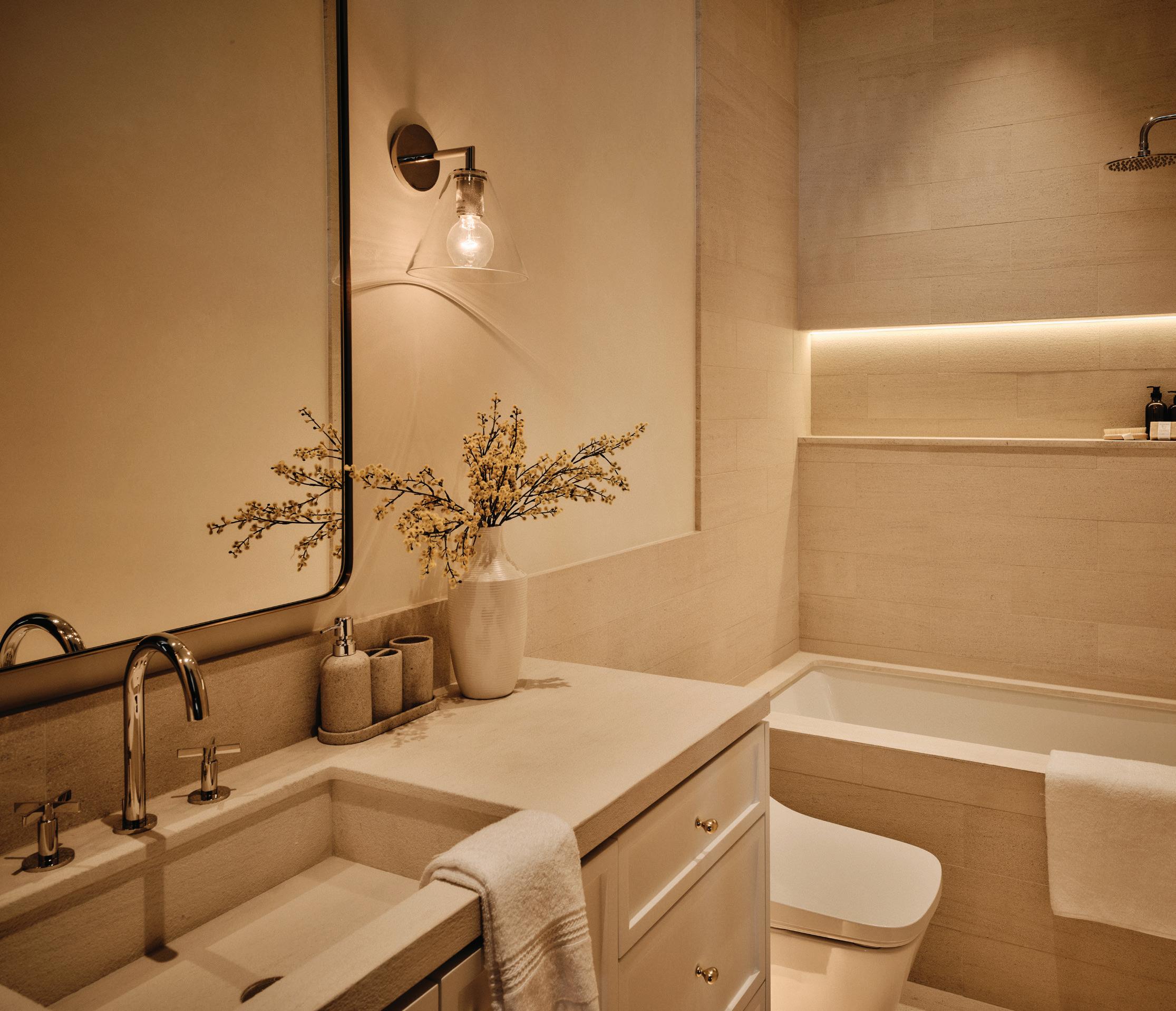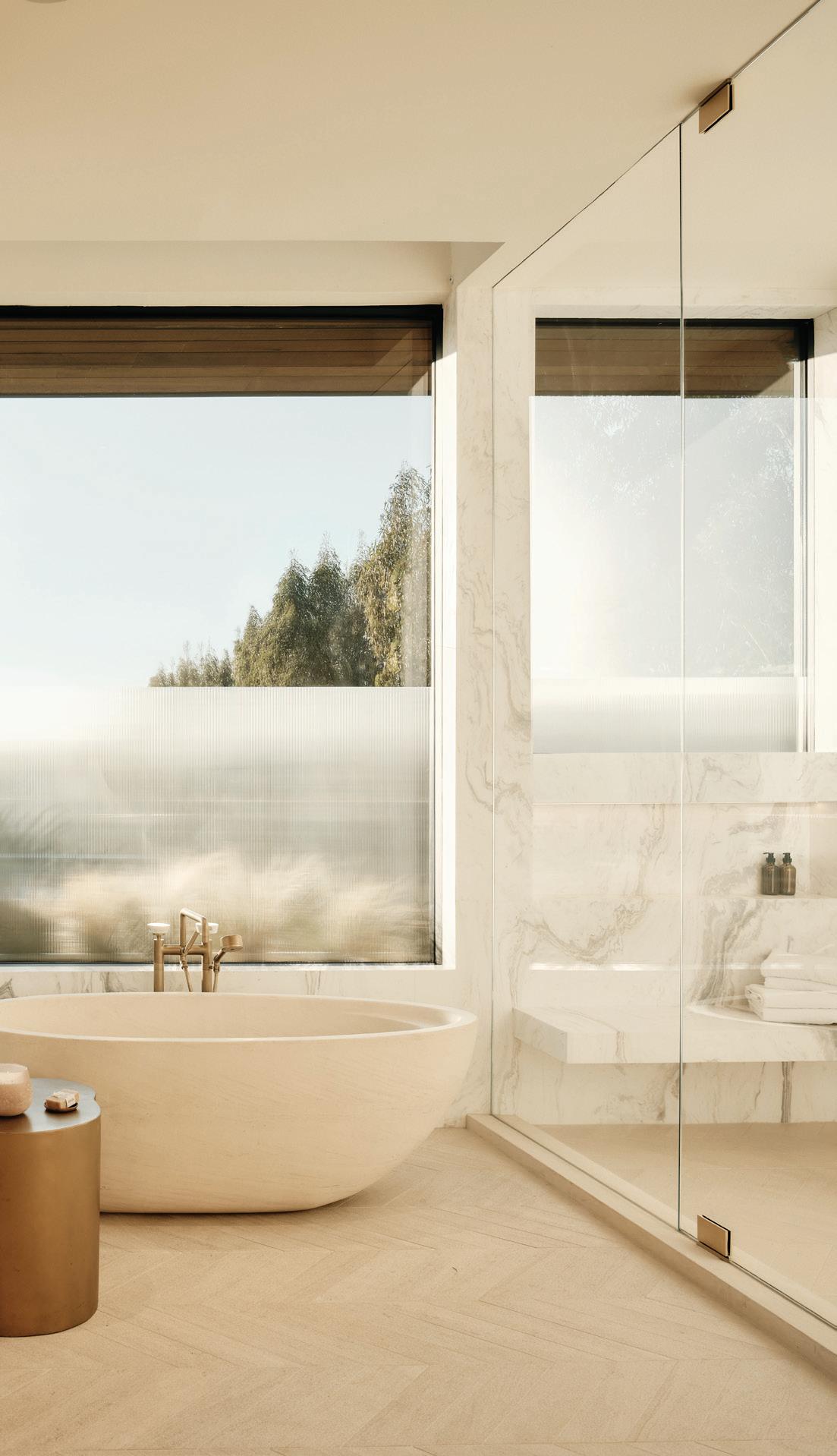 The spa-inspired dual bathrooms are clad in Italian limestone and feature elite amenities, including heated floors, a cosmetic fridge and privacy-enhancing switchable opaque windows.