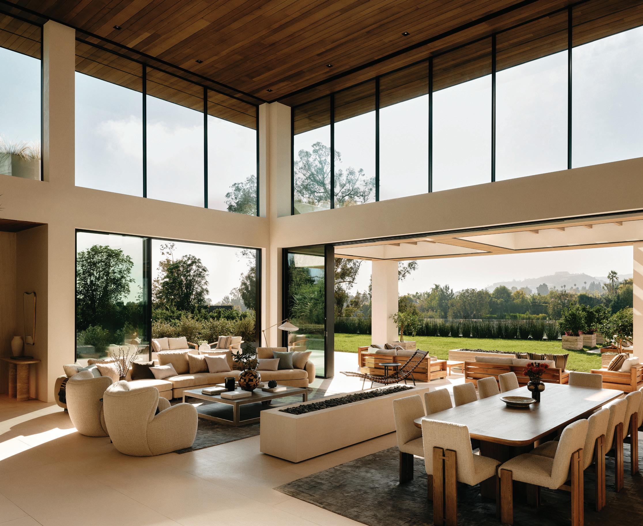Outside, find a full open-air kitchen with a gas grill and Argentinian-style gaucho grill, primed for all-season al fresco hosting. Just beyond is a pool and hot tub—separated by a sunken seating area with a fireplace—plus a sun lounge platform, and a grass lawn outlined with citrus and olive trees in Portuguese limestone planters custom-made on the property.