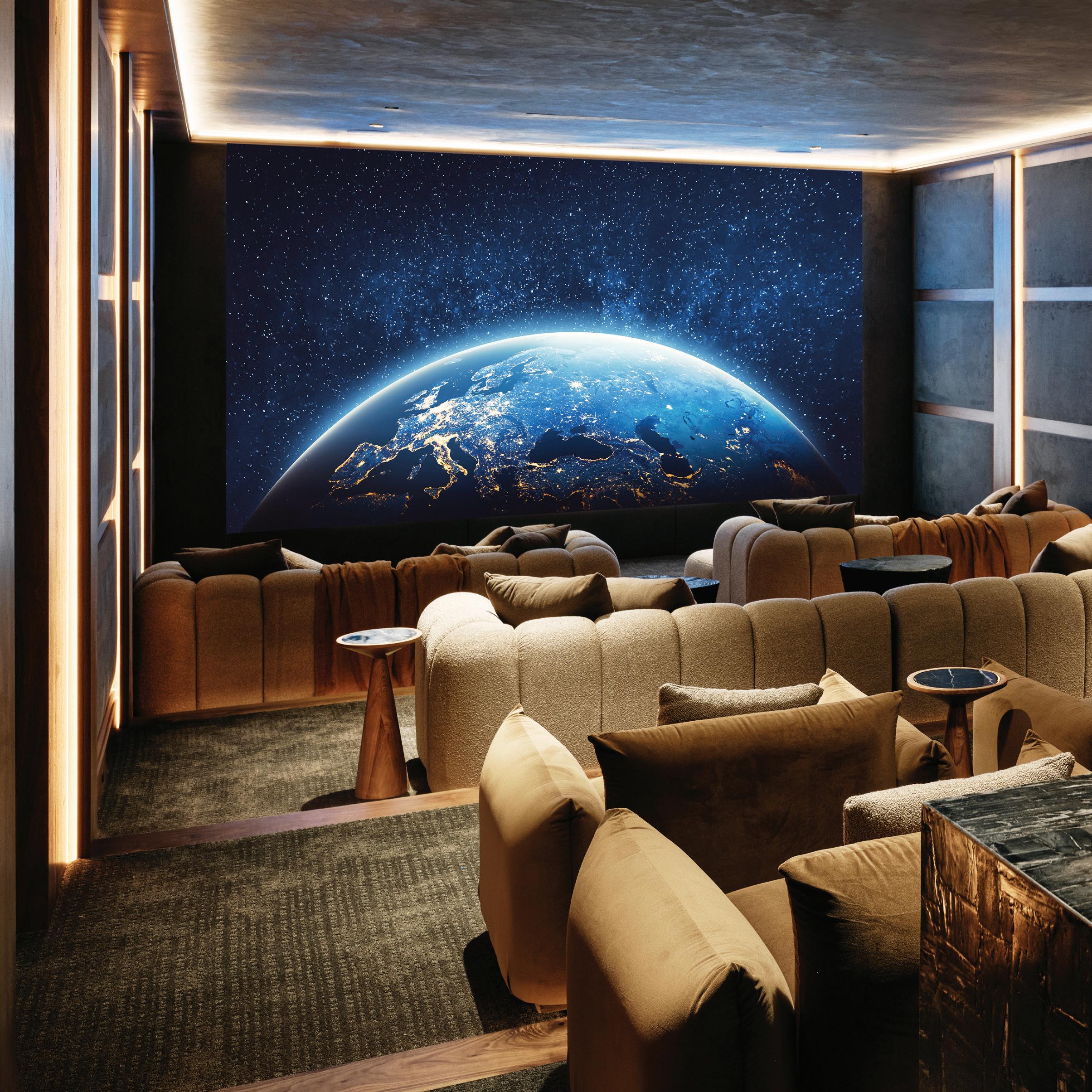 A double-door, 3+ three-row movie theater is wrapped in suede and soundproof.