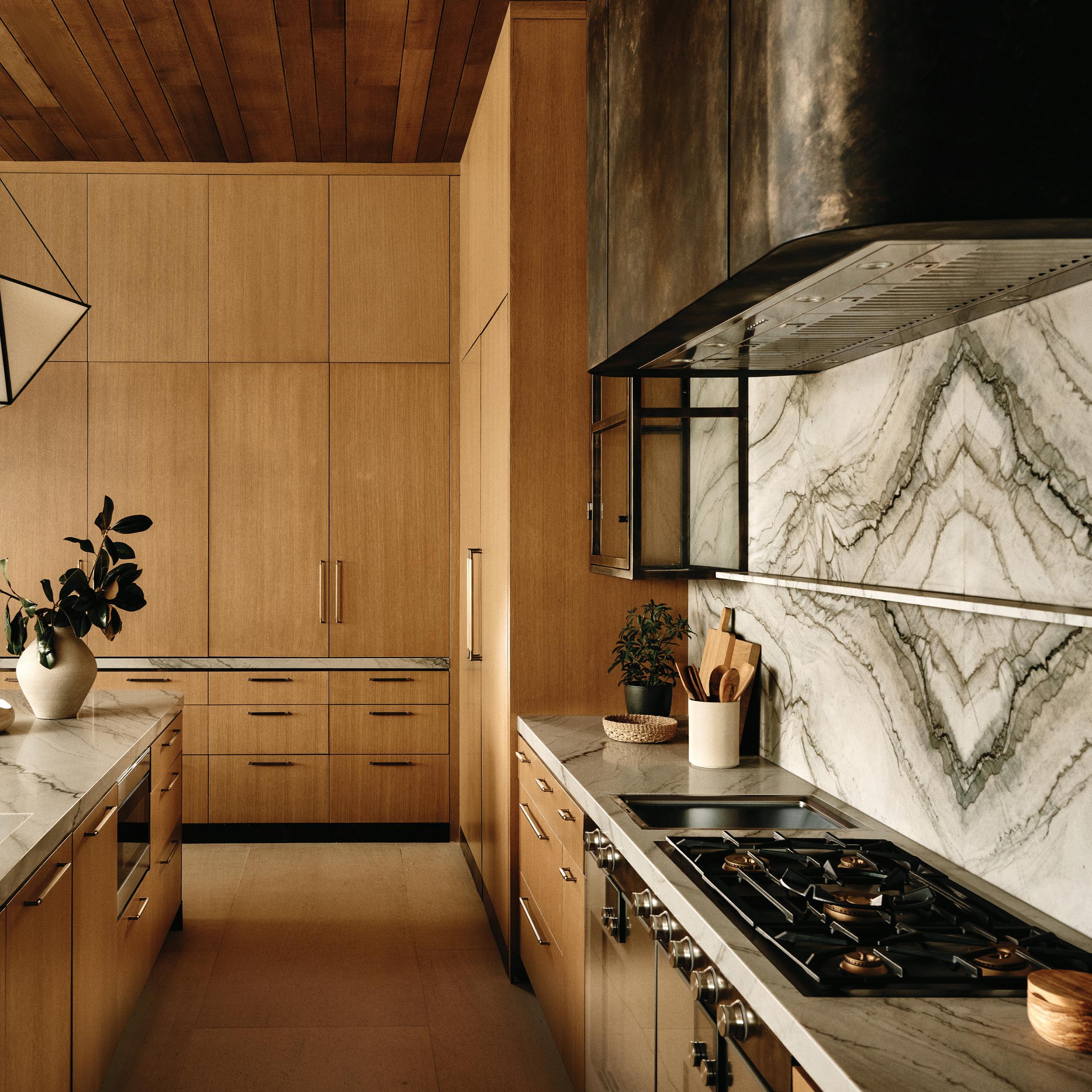 The hosting level’s living spaces include a TV area, dining area and a chef’s kitchen accented by a gorgeous patinaed brass hood, complete with a fireplace. An adjacent industrial kitchen is replete with a walk-in refrigerator, double ovens, stainless steel countertops, a double dishwasher, and Wolf and Sub-Zero appliances.