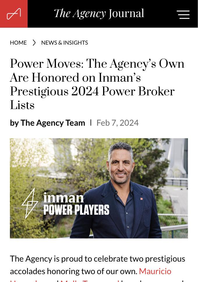 Mauricio has achieved nearly $5 billion in real estate sales and holds the distinction of selling the most homes in the country priced above $20M. He has represented some of the world’s most noteworthy properties, including the Playboy Mansion-the first house in L.A. to sell above the $100M markthe Walt Disney Estate, and residences owned by Michael Jackson, Michael Jordan and Prince. Mauricio and The Agency also represent some of the world’s top developers and resort brands, including One&Only, Rosewood and The Ritz-Carlton. Together with his team, Mauricio is noted as one of the highestproducing agents by The Wall Street Journal’s REAL Trends annual list. He has also received the Entrepreneur Of The Year Greater Los Angeles Award for 2023 and been ranked #69 on Swanepoel’s 2023 Power200, a prestigious list of top real estate executives in the U.S.