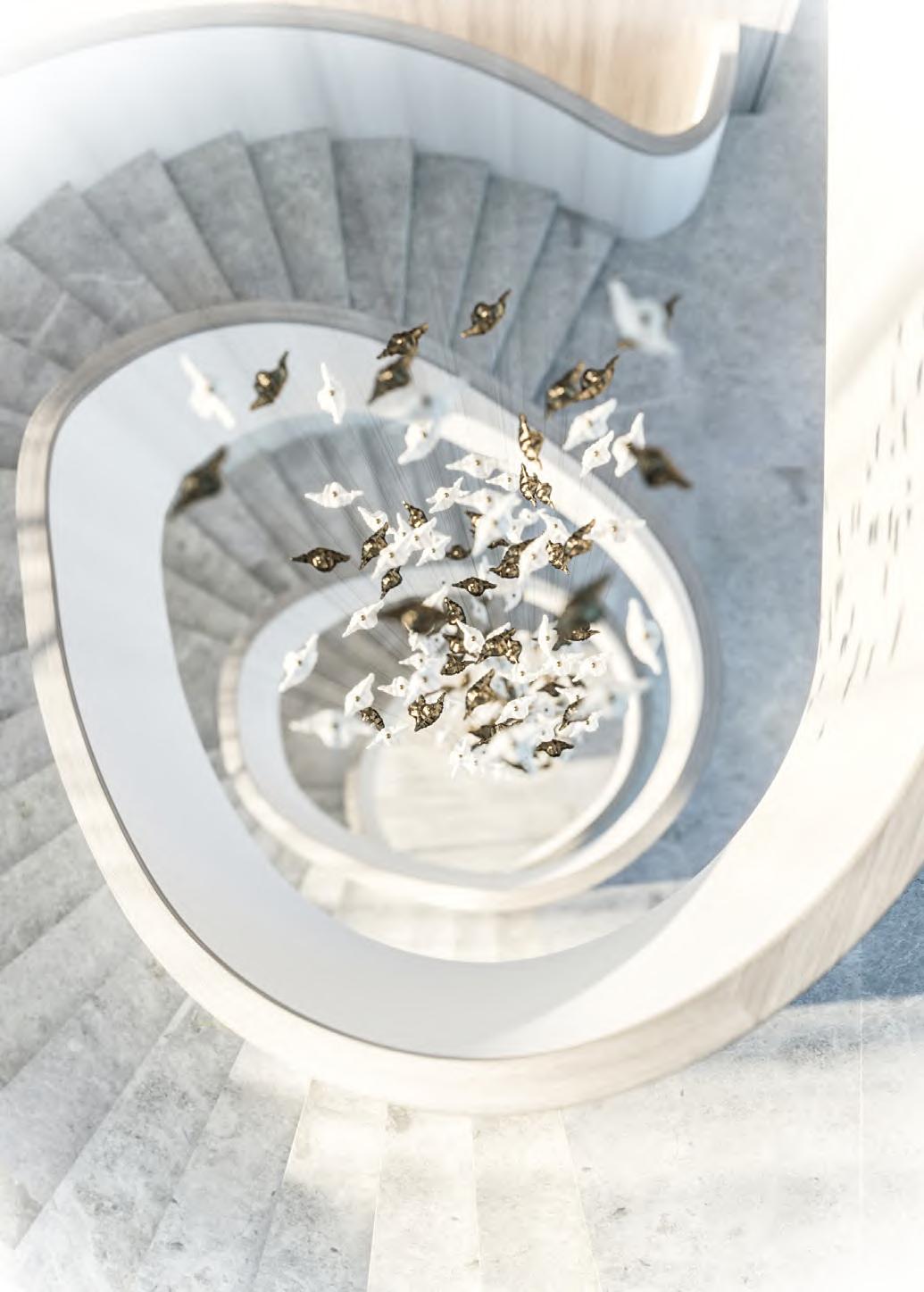 A sculptural ascent, where architectural artistry and impeccable craftsmanship converge, guiding you to the unparalleled elegance above. This eye-catching staircase is sure to awe guests from their very first glimpse. Take pleasure in having such a unique design detail at the center of your home.