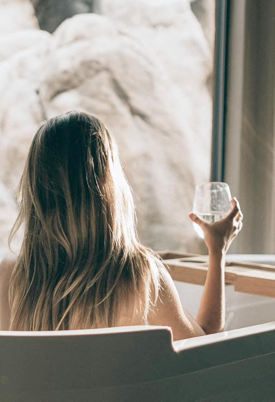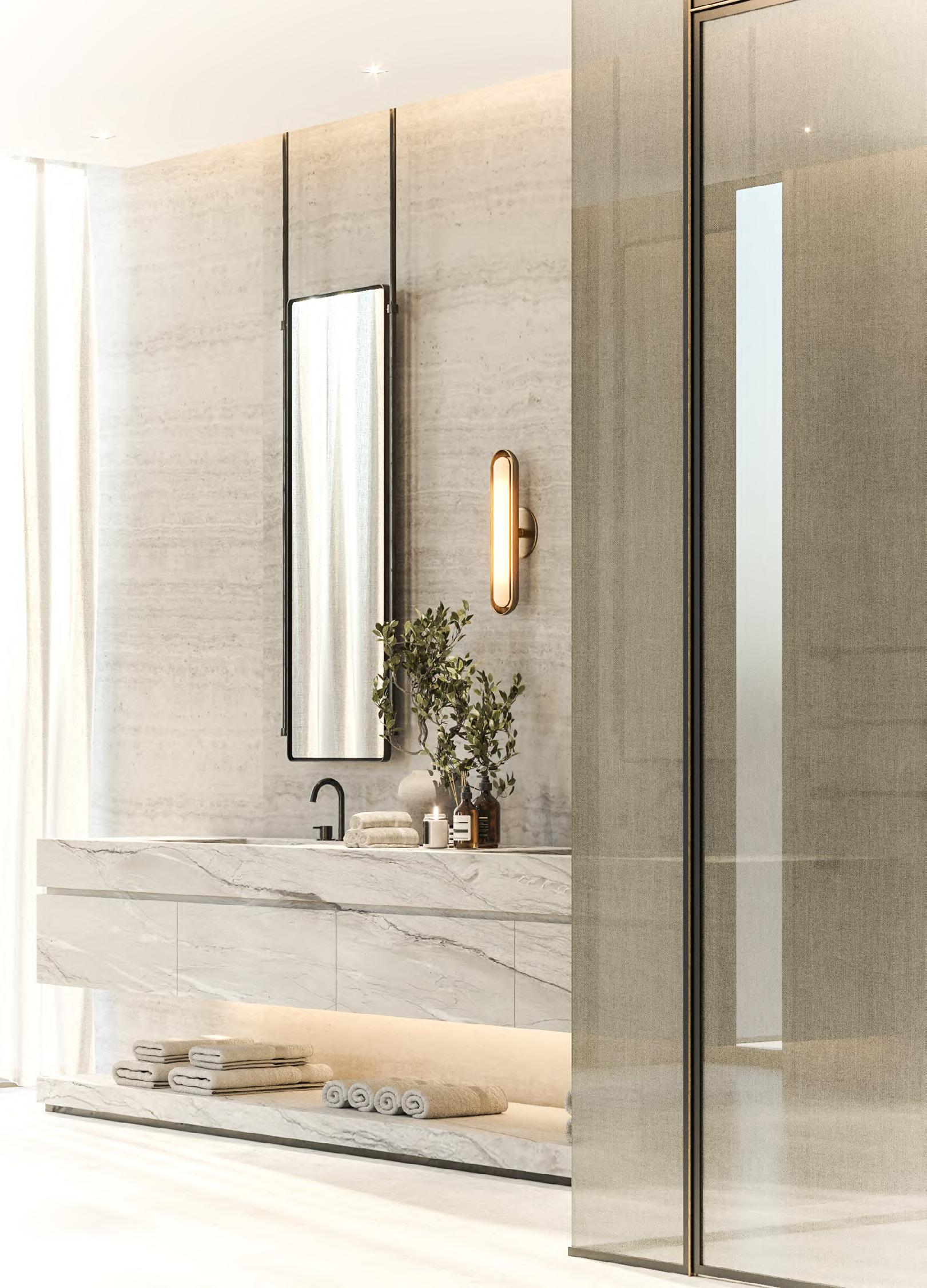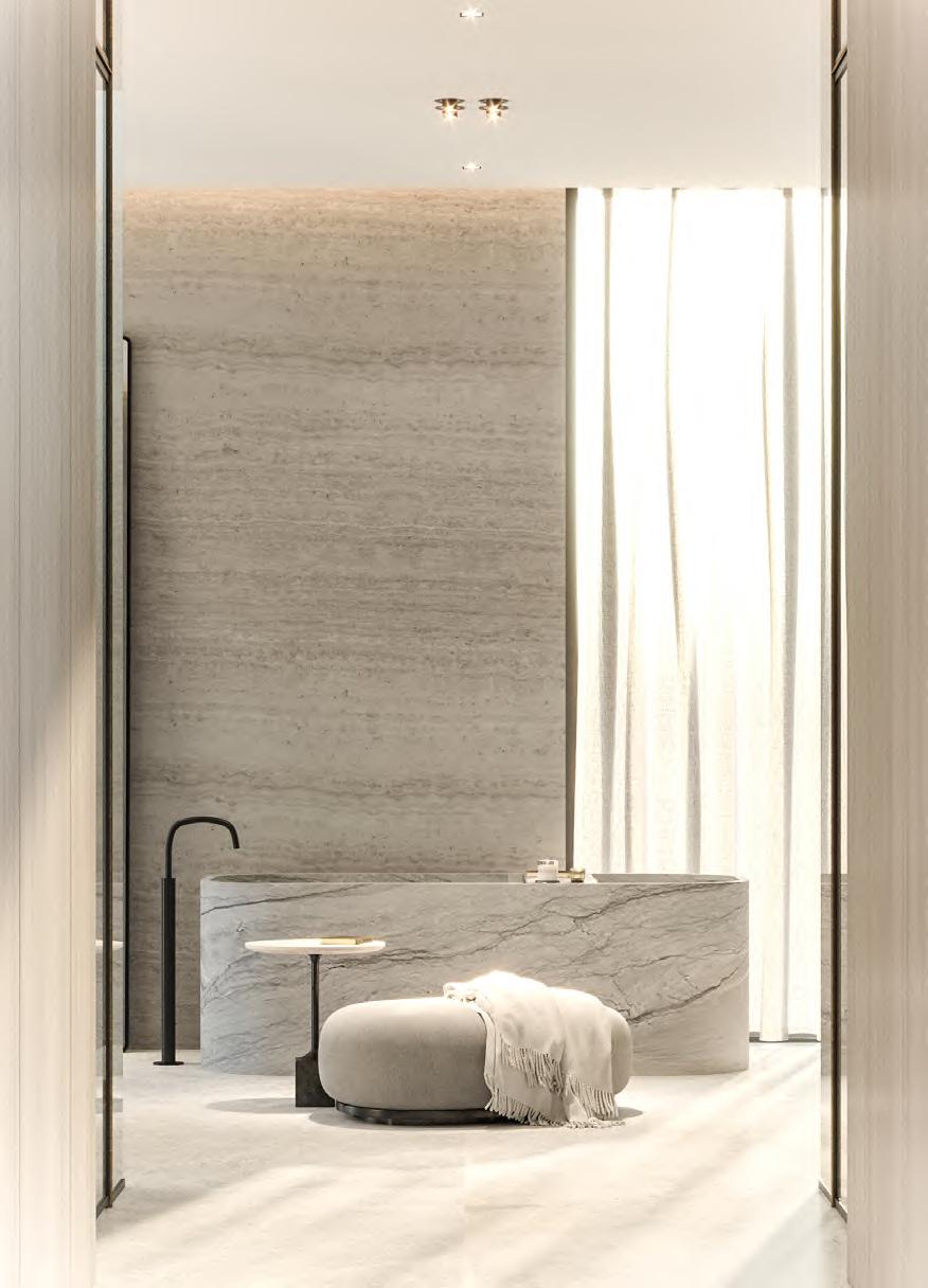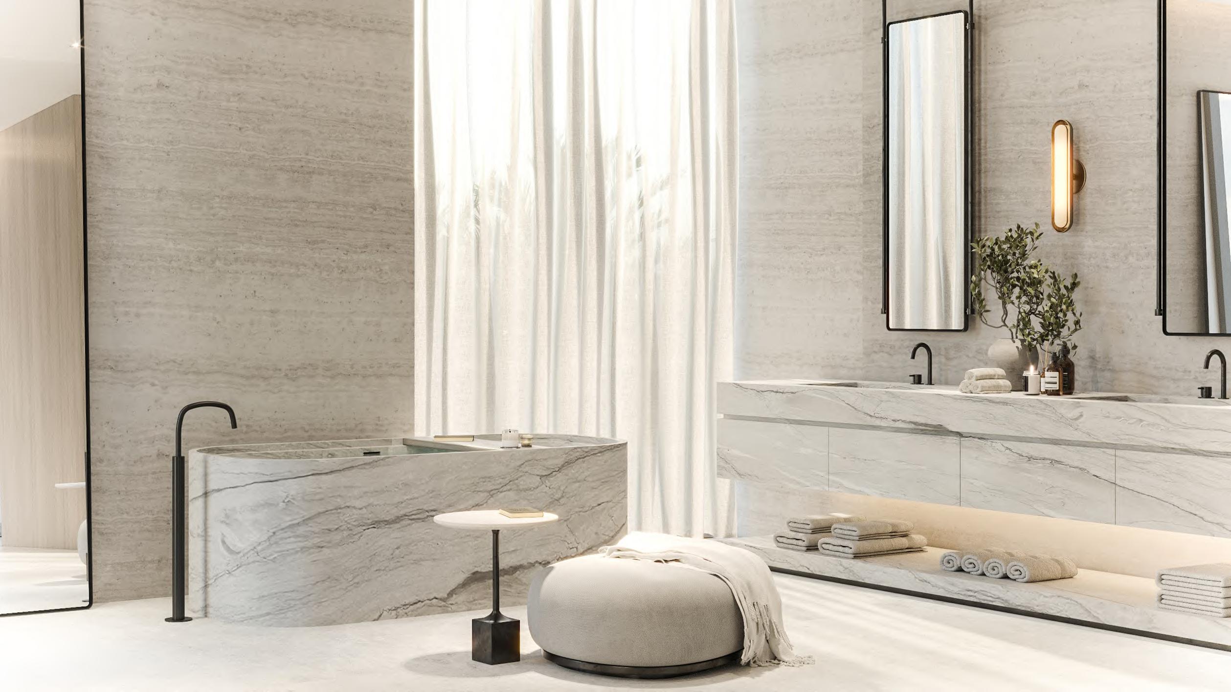 A spa-inspired haven, where marble surfaces and ocean light create an oasis of calm and indulgence. This full bathroom features beautiful natural lighting, elemental finishes, and a stone tub.