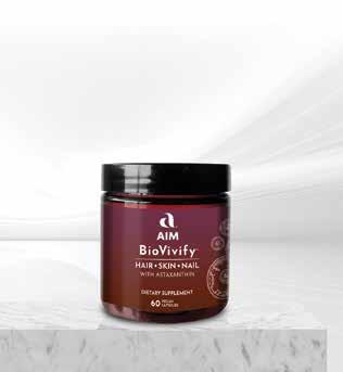 CalciAIM 14.1 oz/400 g citrus powder Calcium, vitamin D, magnesium, zinc, copper, vitamin C and L-lysine HCL Helps maintain healthy bones, cartilage, gums and teeth Delivers three types of calcium with absorption-enhancing nutrients in a powder drink mix targeted Providing natural sources of beneficial nutrients from a super selection of AIM supplements. That’s the focus of targeted nutrition for a variety of health needs, including bone, joint and Member $3500 Customer $3750 BioVivify 60 vegan capsules AstaReal® astaxanthin, L-proline, glycine, L-lysine, biotin and vitamin C Helps improve improve skin, hair and nail health Protects collagen from oxidative damage Supports collagen synthesis and hydration Promotes skin smoothness, elasticity and hydration Reduces hair breakage and split ends Improves rough cuticles FREE NON GMO VEGAN GLUTEN FREE NON GMO VEGAN 12 Member $3300 Customer $3500