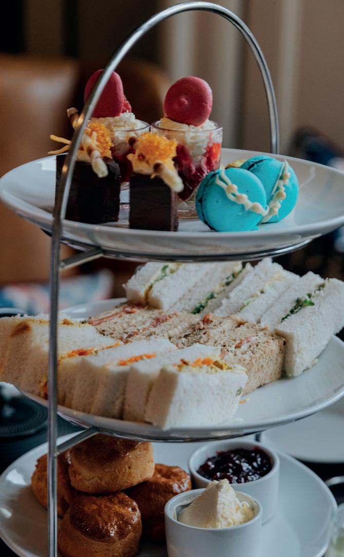 Finger sandwiches, chef’s mini cakes/sweet treats, scones with jam and clotted cream, one serving of tea or coffee
