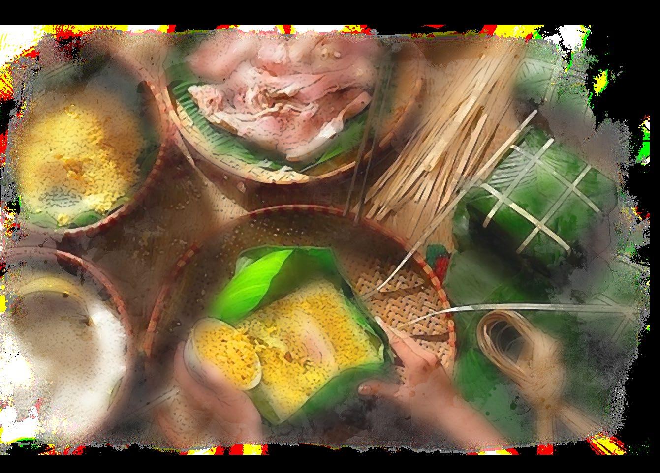 The square-shaped cake, symbolizing the vastness of the earth, is more than a festive delicacy. It is a harmonious blend of fragrant glutinous rice, smooth golden mung beans, and rich, savory pork. Carefully wrapped in layers of vibrant green dong leaves, each Banh Chung is not merely a dish, but a timeless connection between people and nature.