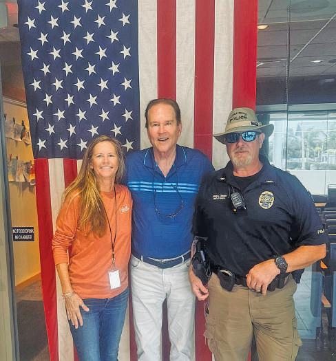 Chief William Tokajer of the Holmes Beach Police Department joins scientist Forrest Masters of the University of Florida’s Project Sentinel team Oct. 8 on the beach, where equipment went up to monitor Hurricane Milton. The weather station was 30-feet tall and could transmit in real time video feeds and data, such as wind speed, water depth, wave height and direction, storm surge, erosion and hazardous water-quality conditions to National Weather Service offices, the National Hurricane Center and more. Islander Photo: Courtesy HBPD