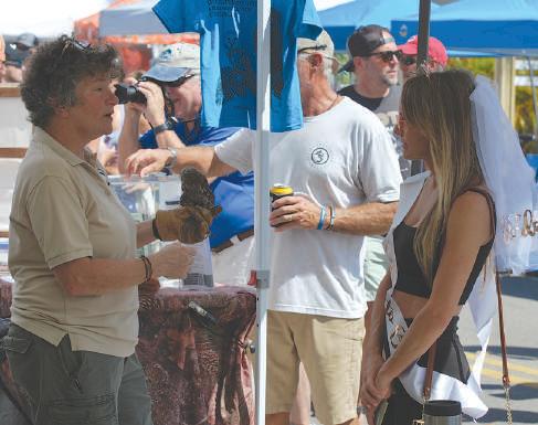 tOP: Aaron Fellows, carrying Fisher, the family dog, explains the concept of carhops and drive-in diners to his son, colin, 7, as wife Erin listens Oct. 15 at the 21st annual Bayfest street festival on Pine Avenue in Anna Maria. the Fellows, of Palmetto, are longtime Bayfest attendees. ABOvE: Erin Hinds of Sebring treats her nieces to Kona shaved ice at Bayfest. ABOvE RIgHt: Bayfest emcee-entertainer Mike Sales sings “Pontoon” for midday festival attendees. For more on Bayfest, page 12. Islander Photos: Kane Kaiman