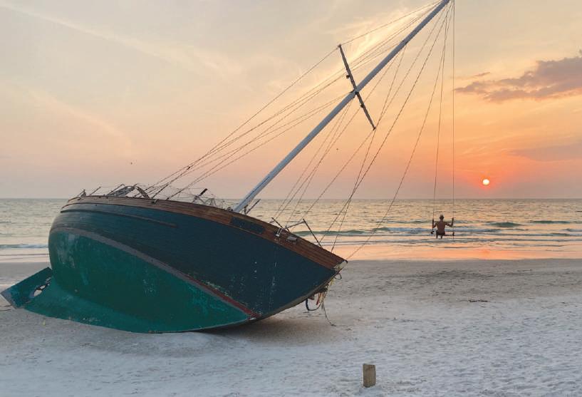 a man watches the sunset march 8 from a swing made with a skateboard seat hung from the rigging of a stranded sailboat, Lucky us 2. the sailboat beached feb. 12 in holmes Beach near 79th street after its crew was rescued by the u.s. coast guard during a storm the night before. the boat owner, michigan resident James golembiewski, launched “help unbeach ‘Lucky us 2’” on the gofundme platform to raise money for the vessel’s removal. he was ordered by the florida fish and Wildlife commission to remove the boat but an appeal awaits a hearing. the money campaign had raised $5,983 toward its $15,000 goal as of march 18. Islander Photo: courtesy terrence Kerr