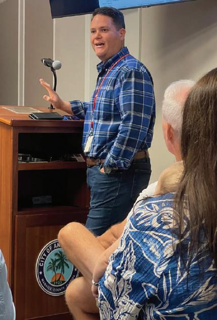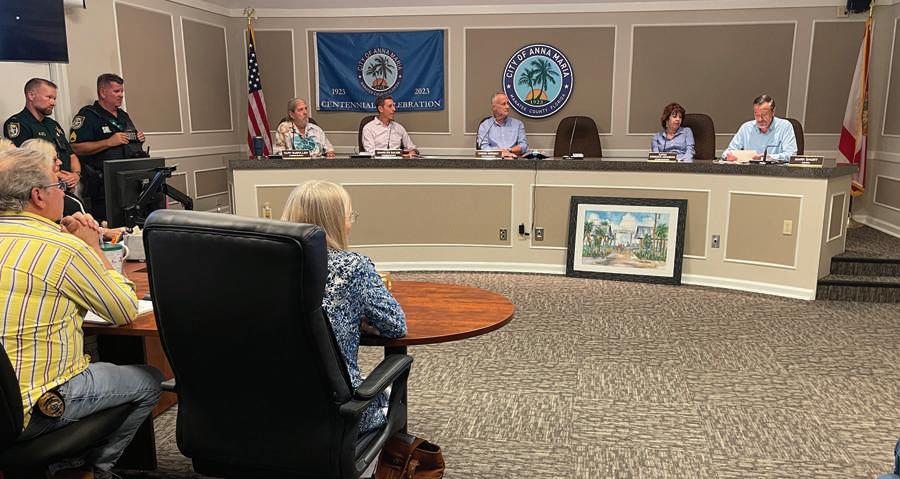 At the dais Nov. 19, from left, Commissioners Gary McMullen, Charlie Salem, Chris Arendt and Kathleen Morgan and Mayor Mark Short begin their meeting with recognition and honors for former Mayor Dan Murphy, who was absent for medical reasons, according to his wife, Barbara, who accepted a plaque from the city on his behalf, pictured lower left. Also pictured, Luis Laracuente, Tampa Bay region district director for U.S. Senator Rick Scott, who also recognized Dan Murphy for his service to the city. Islander Photos: Bonner Joy