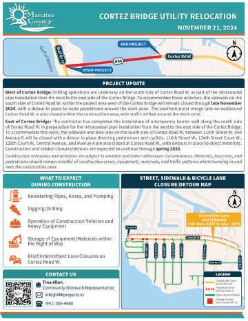 The contractor plans to transport pipe on Cortez Road West and stage the materials behind a temporary barrier wall in the right of way on the south side of Cortez Road West, east of the Cortez Bridge.