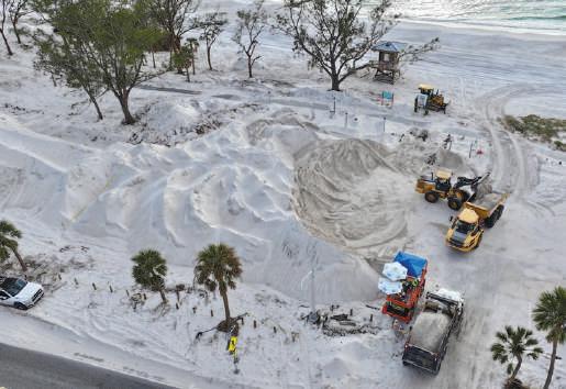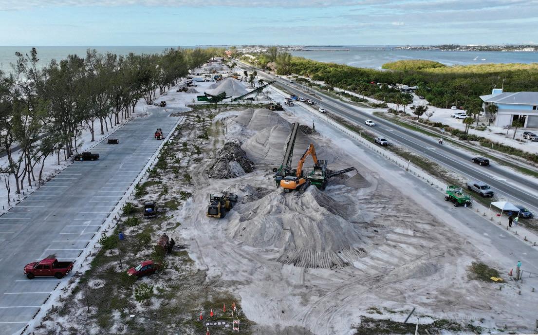 From Manatee County’s “Designated Management Site,” the south Coquina Beach parking lot looking north, the sand operation — cleaning, sifting, loading and moving displaced sand back to the beaches — is ongoing. The mammoth process is expected to be completed by the end of December. The final collection of debris — zone by zone, street by street — was set to begin Nov. 25 in Holmes Beach. Islander Photos: Jacob Merrifield Gathering.