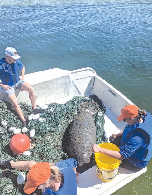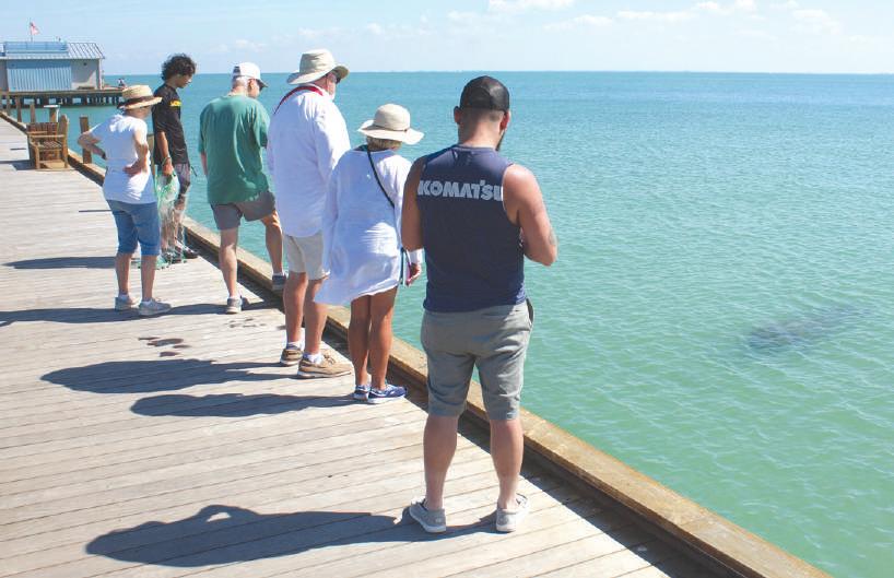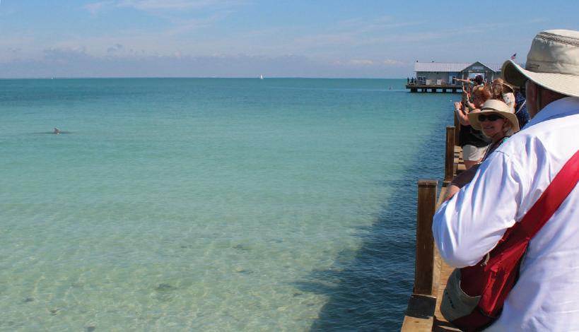 People gather March 1 on the walkway of the anna Maria city Pier, 100 N. Bay Blvd., anna Maria, as a dolphin breaks the surface in Tampa Bay. Meanwhile, the clock ticks on the Mote Marine Laboratory and aquarium installation on the T-end. More, page 9. Islander Photos: ryan Paice