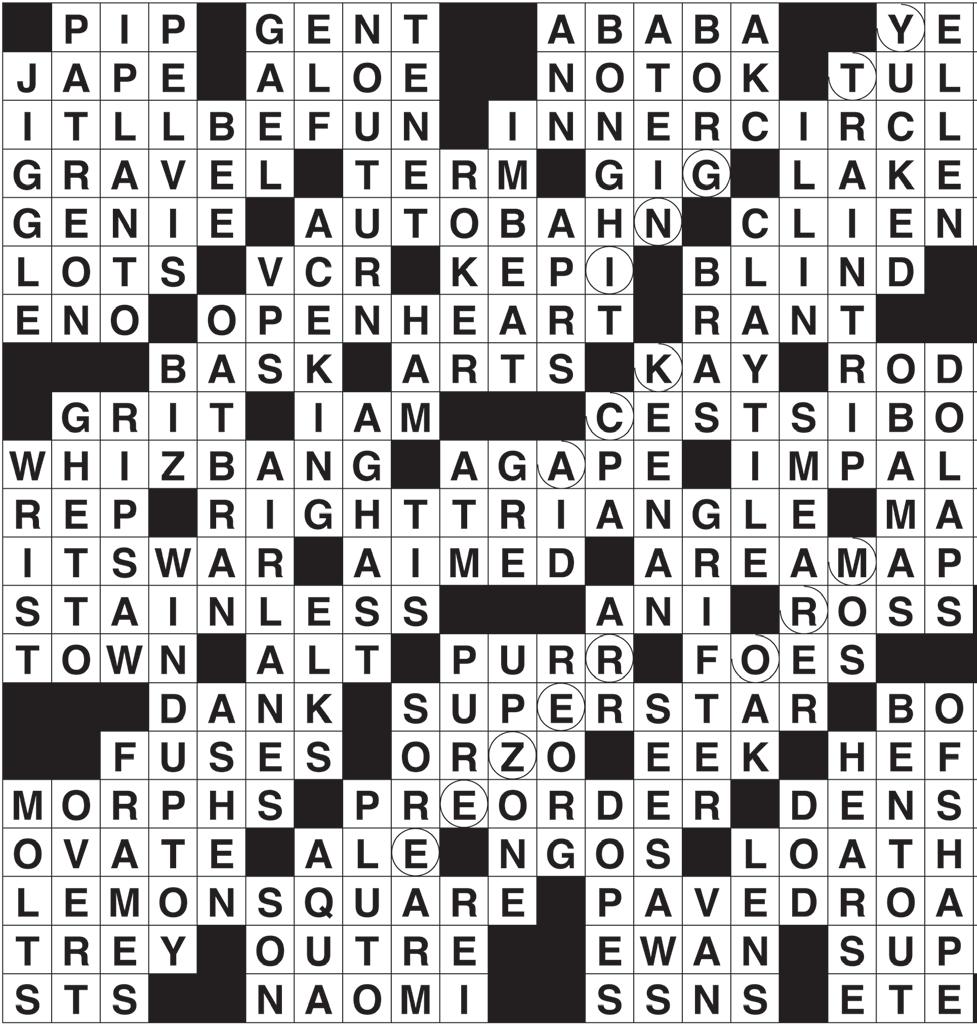 Dec. 14, 2022 THE ISLANDER | islander.org Page 27 WE LIKE LIKES facebook.com/ Islandernewspaper AMI SUN - COLOR 3X3 164583 06-16-21 EDS T hinking about what is best for your rental property? If so, choose QUALITY over quantity, and get in touch with us! 3340 E. Bay Drive, HB Office 941 462 4016 GOING OFF ON A TANGENT BY ADAM WAGNER / EDITED BY WILL SHORTZ No. 1204 RELEASE DATE: 12/11/2022 ACROSS 1 Gambling spot? 4 Chap 8 Addis ____ 13 Pro response 16 Bit of chicanery 17 ____ water (healthful drink) 18 Totally uncool 19 Rock’s Jethro ____ 20 ‘‘You’re gonna love this, I promise!’’ 22 Urban area typically with the tallest buildings 24 Rocky road topping? 25 Length for a pregnancy 27 Moneymaking venture 28 LeBron James became one in 2018 29 That’s the spirit! 30 Highway network that famously has sections without a speed limit 32 Service recipient 33 An ocean 34 Device dusted off to watch old home movies, maybe 35 Flat-topped French hat 36 Ante alternative 37 Musician Brian 38 Public court proceeding 40 Many a bad Yelp review 41 Luxuriate (in) 42 They’re not sciences 43 ____ Cannon, creator of the ‘‘Pitch Perfect’’ film series 44 Fish sticks? 48 Strength of character 50 ‘‘Me!’’ 52 Compliment to a French chef 54 Crackerjack 56 Slack-jawed 59 Automotive successor of the Bel Air 60 Proudly embody, informally 61 What you’re on when you’re making progress 64 Product sold on a rack, informally 65 ‘‘Them’s fightin’ words!’’ 67 Set one’s sights 68 Welcome-center handouts 70 Free of flaws, as a reputation 72 DiFranco of folk 73 Sewer in American history 74 Hamlet’s cousin 75 Music-genre prefix 76 Ideal engine sound 79 Duel personalities? 81 Like some memes 83 Major concern for a meteorologist 85 The Bruins, on scoreboards 88 Contents of a household box 89 Pasta whose name means ‘‘barley’’ in Italian 90 Startled scream 91 Weight 92 Goes from one thing to another 94 Purchase option for a dedicated fan 96 Like dumbbells 97 Like Roma tomatoes 98 Something that may be sold by the yard 99 The Nature Conservancy and World Wildlife Fund, e.g., in brief 100 Hate, hate, hate 101 Certain juicing need 104 Residential construction project 106 Deep shot, in hoops 107 Weird 108 Brother of Logan Roy on ‘‘Succession’’ 109 Has a meal 110 Urban grid: Abbr. 111 Tennis champ ____ Osaka 112 Figs. first issued in 1936 113 Summer on the Riviera DOWN 1 Subscription platform for online-content creators 2 ‘‘That is my intention’’ 3 Where the ilium and ischium are 4 Inhabitant of Ireland or Scotland 5 Holiday helper 6 Sign that you can’t go back now? 7 Philosophical pillar 8 ____ Arbor, Mich. 9 Deep inhalation to get high 10 Ordered delivery, perhaps 11 Hive mind of ‘‘Star Trek: TNG,’’ with ‘‘the’’ 12 National Dog Show org. 13 ____ someone’s yum (criticized a person’s tastes, slangily) 14 Discovery astronaut Ochoa 15 With it 16 Shake a little 19 Amtrak booking 21 Worker with wax 22 ‘‘Oof, what a day!’’ 23 Run-D.M.C.’s ‘‘You Be ____’’ 26 Longtime co-host of the annual Macy’s Thanksgiving Day Parade 30 Good Texas hold ’em hand 31 Auto-loan figs. 32 Bit of roofing in Spanish-style architecture 34 Biden and Harris, notably, in brief 36 Underwire undergarments 38 Muffin makeup, maybe 39 Over-emoter 41 Trade, informally 43 Star N.F.L. widereceiver Allen 45 First family from Illinois 46 Exercise in a swimming pool 47 Grabs 48 ‘‘____ Life’’ (1981 Rick James single) 49 Tool for cutting wood along the grain 51 Scandalized 52 Pro who gets many return customers? 53 Bad makeup artist 54 Spot for a band 55 High ways 56 Early stop at a casino, maybe 57 Univ. senior’s hurdle 58 Funding 62 ‘‘____ but a scratch’’: oft-quoted Monty Python line 63 Con artist 66 Chattering plastic teeth, for one 69 Rapper ____ Def 71 Group with lodges 72 Part of E.T.A.: Abbr. 76 100% 77 Allow for more highdensity housing and mixed-use development, in urban-planning lingo 78 Company shake-up, for short 80 Symbol of sturdiness 82 Pallid 83 Problem for a pitcher 84 They have their ups and downs 85 & 86 Very upset . . . like the answers to five of this puzzle’s clues? 87 Grand mounts 88 They go around at museums 91 Coffin carrier 92 Drops down? 93 In no way hidden 94 It has only one-sixth of the mass of Earth’s moon 95 Goobers 96 Pentagon inits. 98 Cousin of turquoise 100 Part of the eye that focuses light onto the retina 102 Momma’s boy 103 Big name in outdoor gear 105 Jones of CNN Online subscriptions: Today’s puzzle and more than 4,000 past puzzles, nytimes.com/crosswords ($39.95 a year). Adam Wagner, of Oakland, Calif., is a creative lead at the San Francisco-based 1-Down. (Solve the puzzle to see the name of the company!) He has been constructing crosswords for The Times for two years. This one started with the answers at 85- and 86-Down and branched out, literally, from there. Adam recently released Anigrams, a free daily online word game that I find almost as addictive as Wordle. — W.S. New York Times Sunday Magazine Crossword Answers: page 24 Scan QR code to view this beautiful property Live in Luxury at this Mirabella Villa “When it comes to buying or selling your home, call me first! Let my years of experience work for you.” Chantelle Lewin Broker Associate Licensed since 1983 941.713.1449 3 BR / 2 BA with den plus private pool and hot tub! www.CHANTELLELEWIN.COM $649,900 TOP producer Business news Does your business celebrate achievements? Maybe you’re new in business or your staff deserves kudos. Submit your information to news@islander.org. County commission meetings can be watched on cable TV, as well as streamed online at mymanatee.org and on the Manatee County Commissioner Meetings’ YouTube channel. — Lisa Neff INC Mike Norman Realty 31O1 GULF DR HOLMES BEACH 800-367-1617 • 941-778-6696 www.mikenormanrealty.com sales@mikenormanrealty.com MIKE NORMAN REALTY EST. 1978 RENOVATED HOME JUST STEPS TO BE