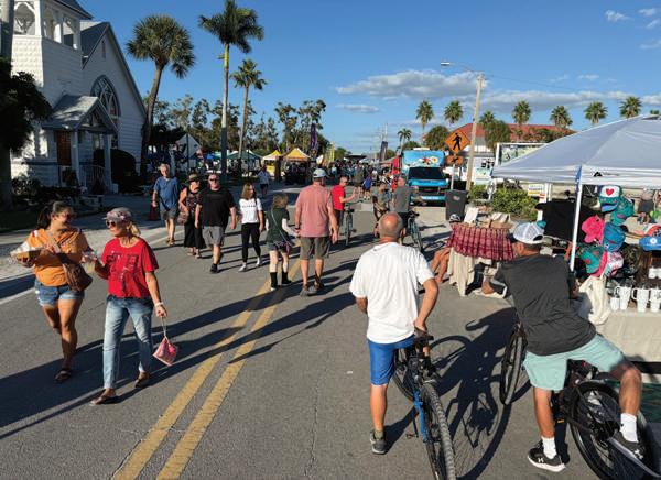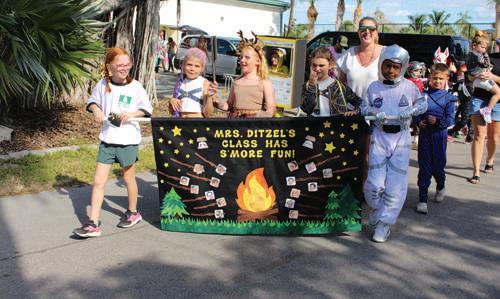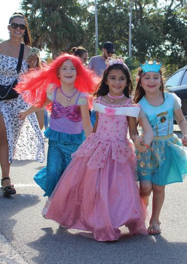 Festivalgoers gather on Pine Avenue in Anna Maria for Bayfest. The event featured an all-day street festival with live music, food vendors, arts and crafts vendors and a classic car show. The Anna Maria Island Chamber of Commerce hosted the event after a 2024 wipeout due to hurricane impacts. RIGHT: Kindergartners Delphi Goodman, left, Mona Krstevski and Adela Lupescu light up the AME PTO Fall Festival parade in Anna Maria. Islander Photo: Robert Anderson