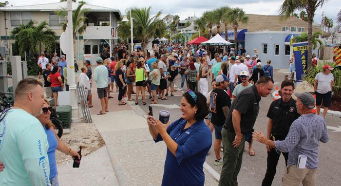 A crowd fills Bridge Street in front of the Drift-In AMI during the Sundown Get Down “Rock the Block” festival Oct. 11 in Bradenton Beach. The Bridge Street Merchants Association event featured live music, vendors, family-friendly activities and ceremonies, as well as coincided with an anniversary party at the Drift-In. A commemorative plaque from the city of Bradenton Beach and the Bridge Street Merchants Association recognized the Drift-In’s 100-year anniversary. More coverage, page 2. Islander Photo: Robert Anderson
