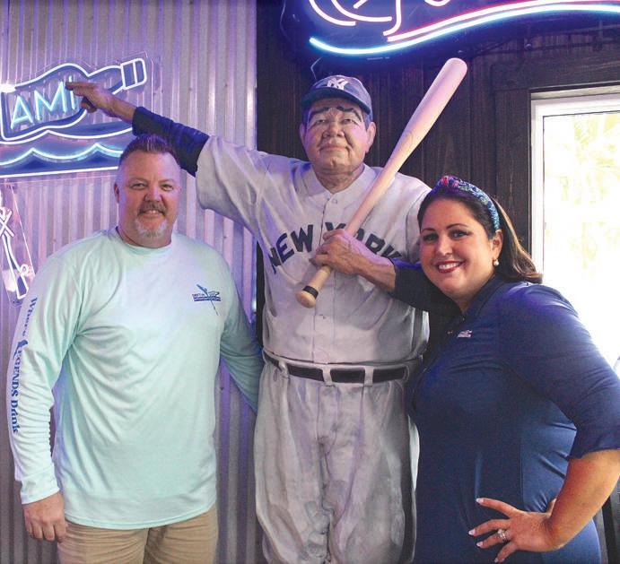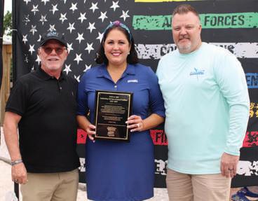 RIGHt: Sherman Baldwin, left, Helena Williams and Derek Williams stand with a commemorative plaque from the city of Bradenton Beach and the Bridge Street Merchants Association that recognizes the Drift-In AMI’s 100-year anniversary. Baldwin spoke about the bar’s history at the presentation.
