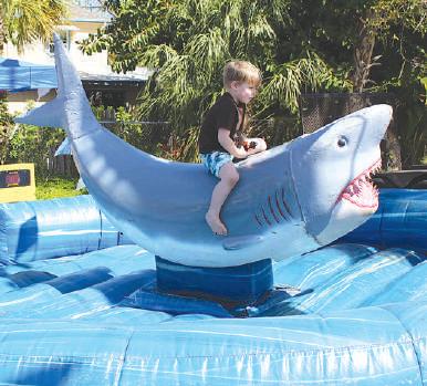 INSeT: Max Merkel, 3, of Annapolis, Maryland, hangs on for a ride Feb. 18 on a bucking shark in the kid’s area of the Cortez festival. Islander