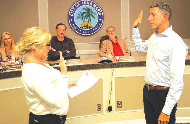 charlie salem, right, recites his oath of office Jan. 26 with the help of anna maria city clerk leanne addy following