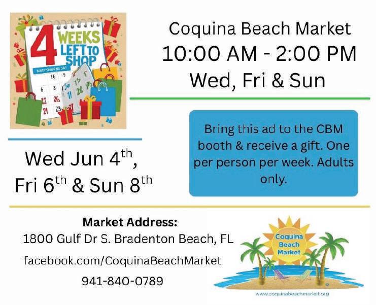 4-7 p.m. — Island Shopping Center open house and hurricane recovery celebration, Marina and Gulf drives, Holmes Beach. Info: 941-778-6694.