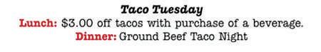 Tuesday: $3 Tacos and Margaritas 4-9, lounge only.