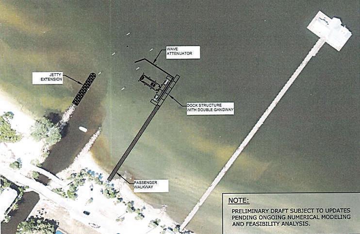 The pier would feature a double gangway dock structure and a wave attenuator to calm the waters around the landing area.