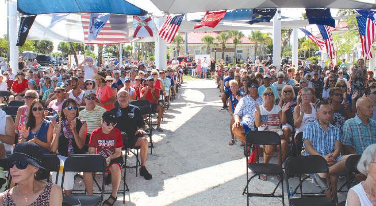 Hundreds of people sit in the shadow of draped flags and shade sails may 30, 2022, at City Pier Park for the memorial Day Symphony Salute in anna maria. This year’s salute will be at 10 a.m. monday, may 29. Islander File
