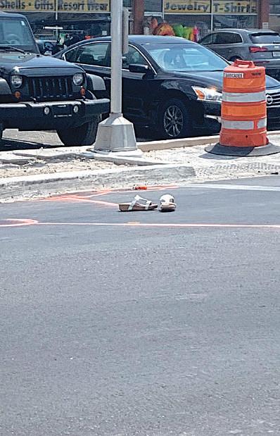 Sandals are left behind near the crosswalk where miriam Trotter, 86, of maryland, suffered injuries that resulted in her death. Her daughter, Deborah, of Holmes Beach, was injured and released from a local hospital. Islander Photo: HBPD