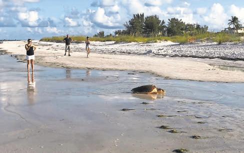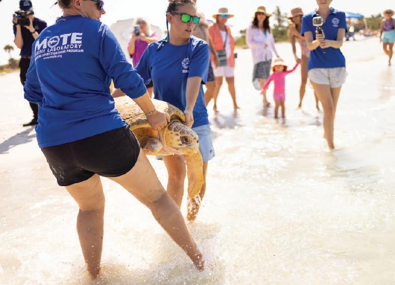 The team from mote marine Laboratory in Sarasota moves a loggerhead sea turtle nicknamed Farmer to the Gulf of mexico at Lido Beach. Farmer was rescued from the shore in Holmes Beach in late February after suffering exposure to red tide and was rehabilitated at mote and released with a celebration may 16. For more on Farmer, go to page 26. Islander Photo: Courtesy mote