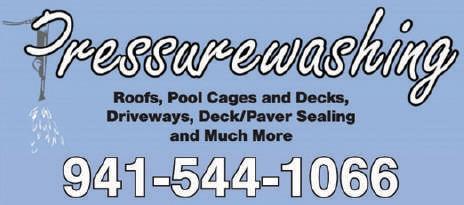 PRESSURE WASHING, PAVER sealing, driveway, roof, fence, pool area. Also, window cleaning. Licensed and insured. 941-565-3931.