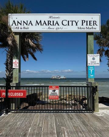 The gate at the base of the Anna Maria City Pier’s former walkway remains closed Sept. 30 as the city continues on a path toward a rebuild. Islander Photo: Robert Anderson