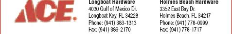 • Holmes Beach: A Paradise Realty, 5201 Gulf Drive; Anna Maria Island Chamber of Commerce, 5313 Gulf Drive; Duffy’s Tavern, 5808 Marina Drive; the Feast Restaurant, 5406 Marina Drive; Grooms Motors and Automotive, 5608 Marina Drive; Holmes Beach Post Office, 5354 Gulf Drive; Hurricane Hanks, 5346 Gulf Drive; Publix Super Market, 3900 E. Bay Drive; the Waterline Resort, 5325 Marina Drive; and Cheesecake Cutie & Cafe, 3324 E. Bay Drive.
