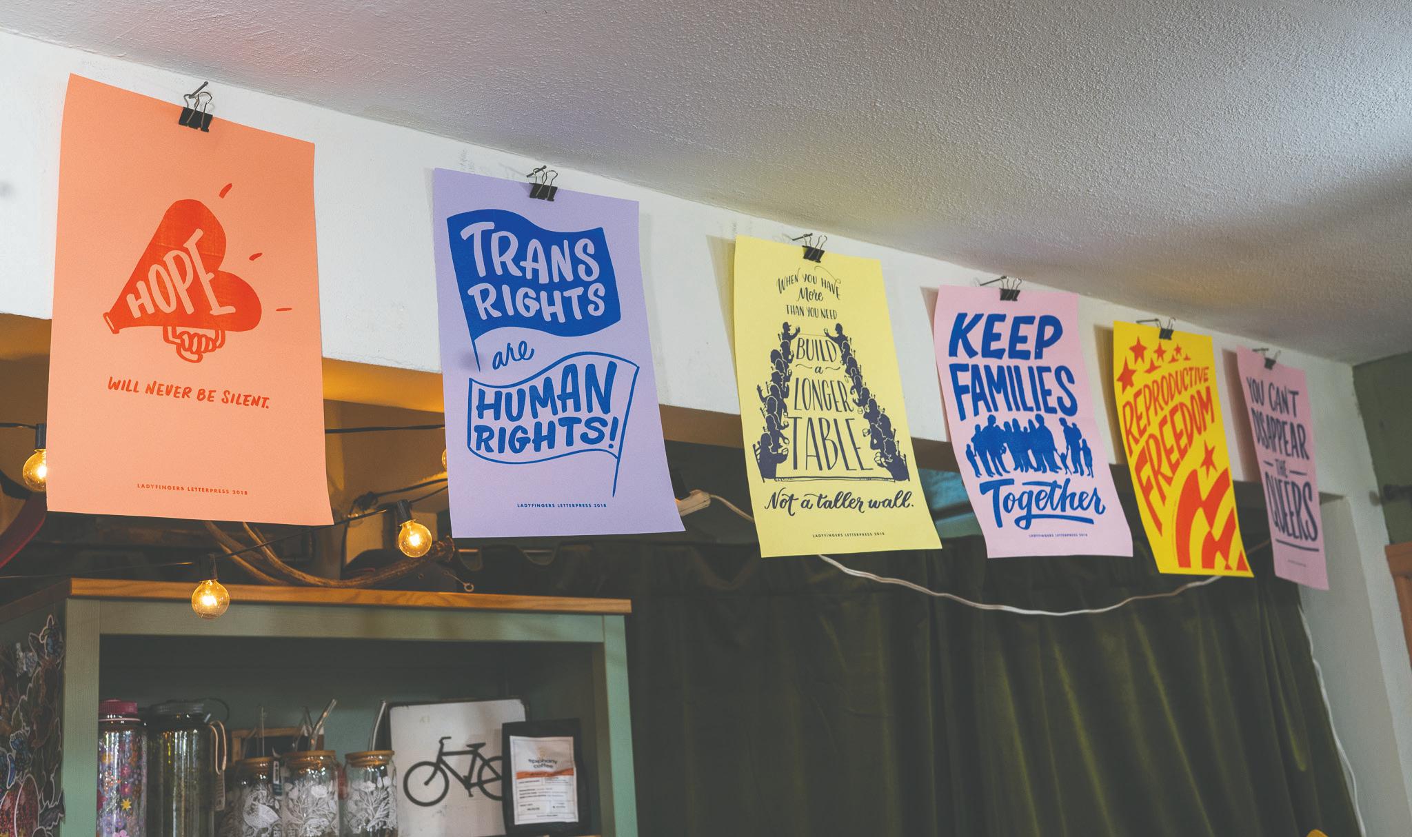 A variety of pastel-colored posters with sentiments that read “Hope will never be silent”, “Keep families together” and ”Build a longer table, not a taller wall” were sold for $10, with all profits donated to a rotating list of organizations in Idaho.