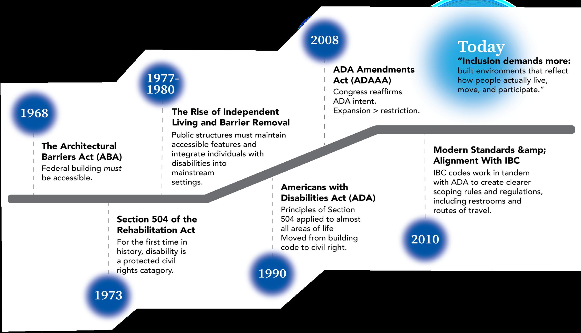 Several landmark milestones for accessibility law include the Architectural Barriers Act (1968), which stated federal buildings must be accessible, Section 504 of the Rehabilitation Act (1973), when disability became a protected civil rights category and the ADA Amendments Act (2008), where Congress reaffirmed the ADA’s intent and highlighted the value of expansion versus restriction when it comes to accessibility law.