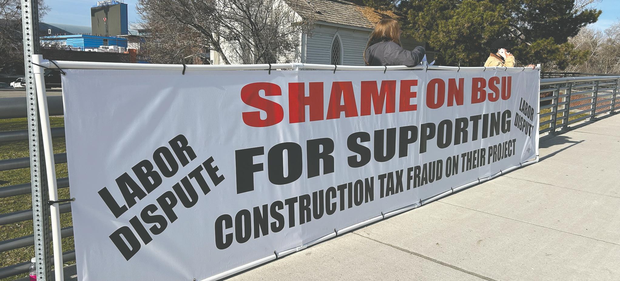 Labor Union Carpenters 635, the group behind the banner, alleges Boise State is not meeting area labor standards for carpenter craft workers. A flyer that was handed out by individuals at the banner reads, “Shame on BSU and Summit Wall Systems Inc. for contributing to erosion of area standards…”