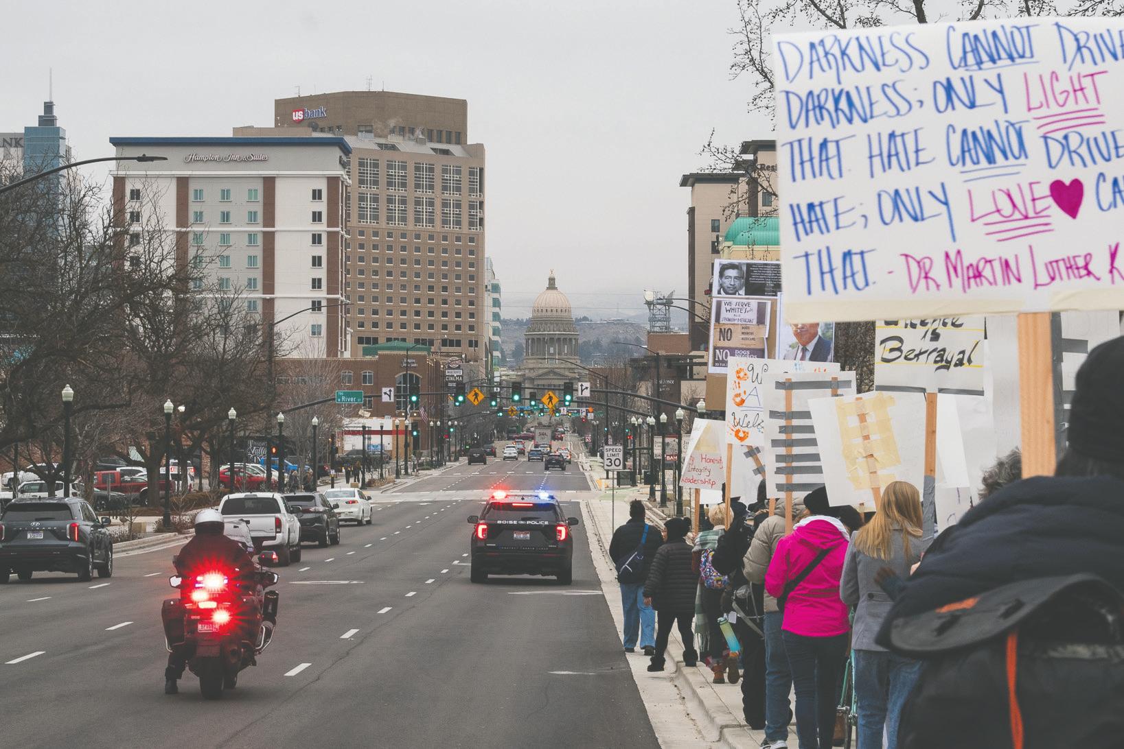In a procession from the Student Union Building to the Capitol Building, Boiseans looked on at the street spectacle and cars honked in support as protesters