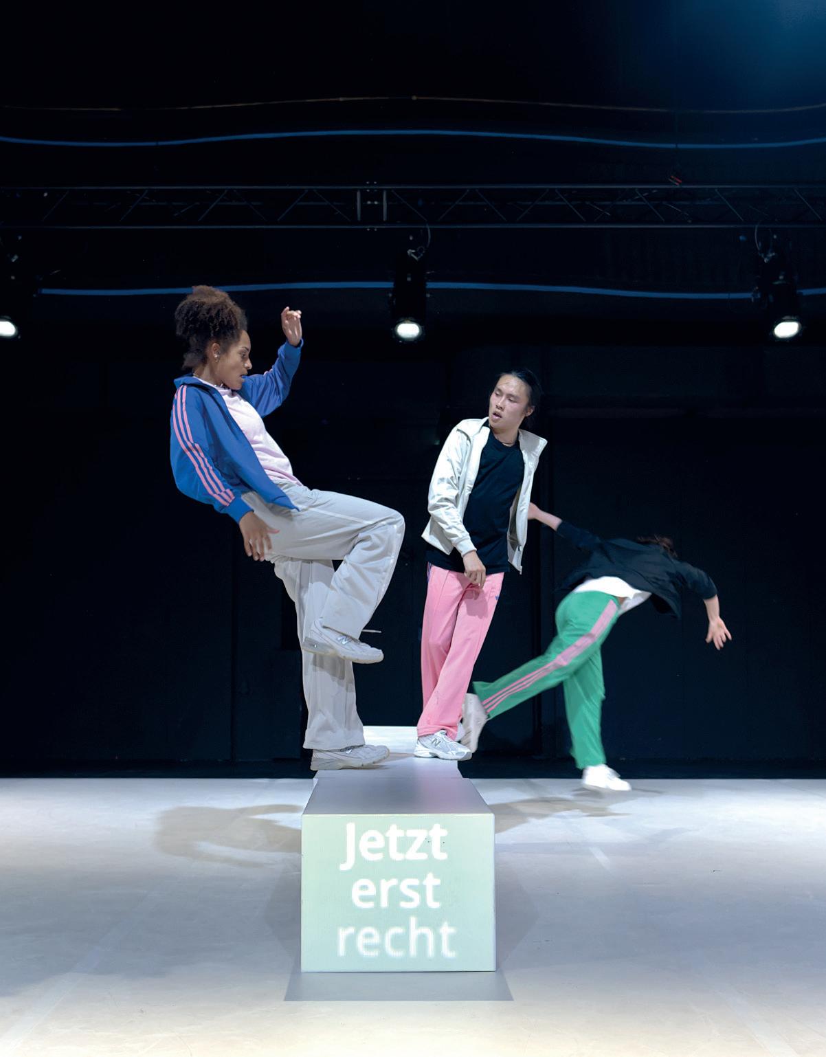 Ein Rap feministischer Stimmen –wild, nachdenklich, rebellisch. Drei Tänzer*innen und eine Sängerin rütteln an Ungerechtigkeiten. Zitate, Video und Musik werden gesampelt zu einer Collage des Protests, in der das Echo vieler und vielsprachiger Stimmen durch die Zeiten ins Heute hallt: It’s cool to be feminist!