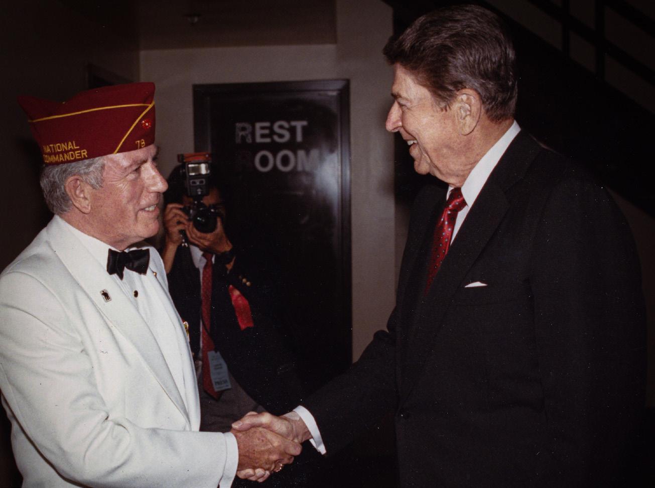 In time, he drew national attention. First appointed to serve on the National Commander’s Advisory Committee on Americanism, he was later elected as Alternate National Executive Committeeman and National Executive Committeeman. Twenty-four years after he first donned a blue cap, John P. “Jake” Comer was presented a new red one, that of National Commander. That was Aug. 27, 1987.