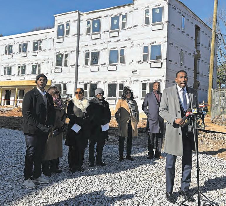 Atlanta Mayor Andre Dickens, Councilmember Jason Dozier, Fulton County Commissioner Mo Ivory, and Partners for Home gathered on a cold, windy Thursday, January 15, for a press conference and hard-hat tour of a new rapid-housing site at 405 Cooper St.