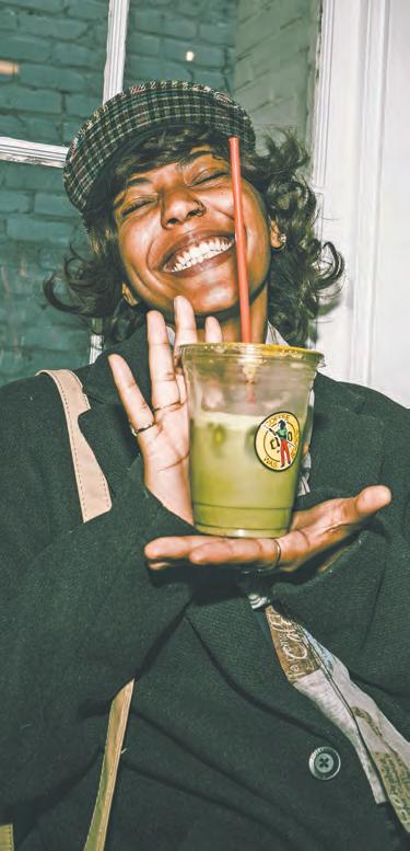 impending noise of highways 85/75. With green matcha dusted over his hands and his white spectacles popping against the melanin on his skin, Malcolm Voltaire moves with precision and accuracy, like that of a chemist or a state-of-the-art seamstress. The purple and green colors of the drinks fuse, creating a work of art with each drop.
