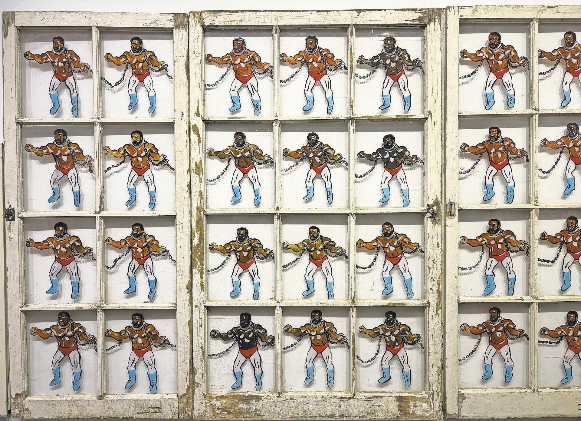 The show takes its title from a 1960s French comic book, a phrase that initially caught the artist’s attention for its cinematic quality and grew heavier as the years passed. The exhibition includes painting, sculpture, and installation threaded through with the logic of quilting, panel compositions built from color blocks, and coded symbolism that draws on African American quilting traditions.