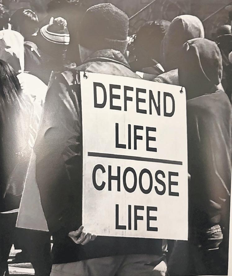 One piece in the exhibition draws from an unexpected source. While out on a morning workout, Golliday said she came across a downtown protest hosted by the Knights of Columbus, a Catholic service organization, and briefly joined in. The encounter, centered on themes of defending life, found its way into her work.